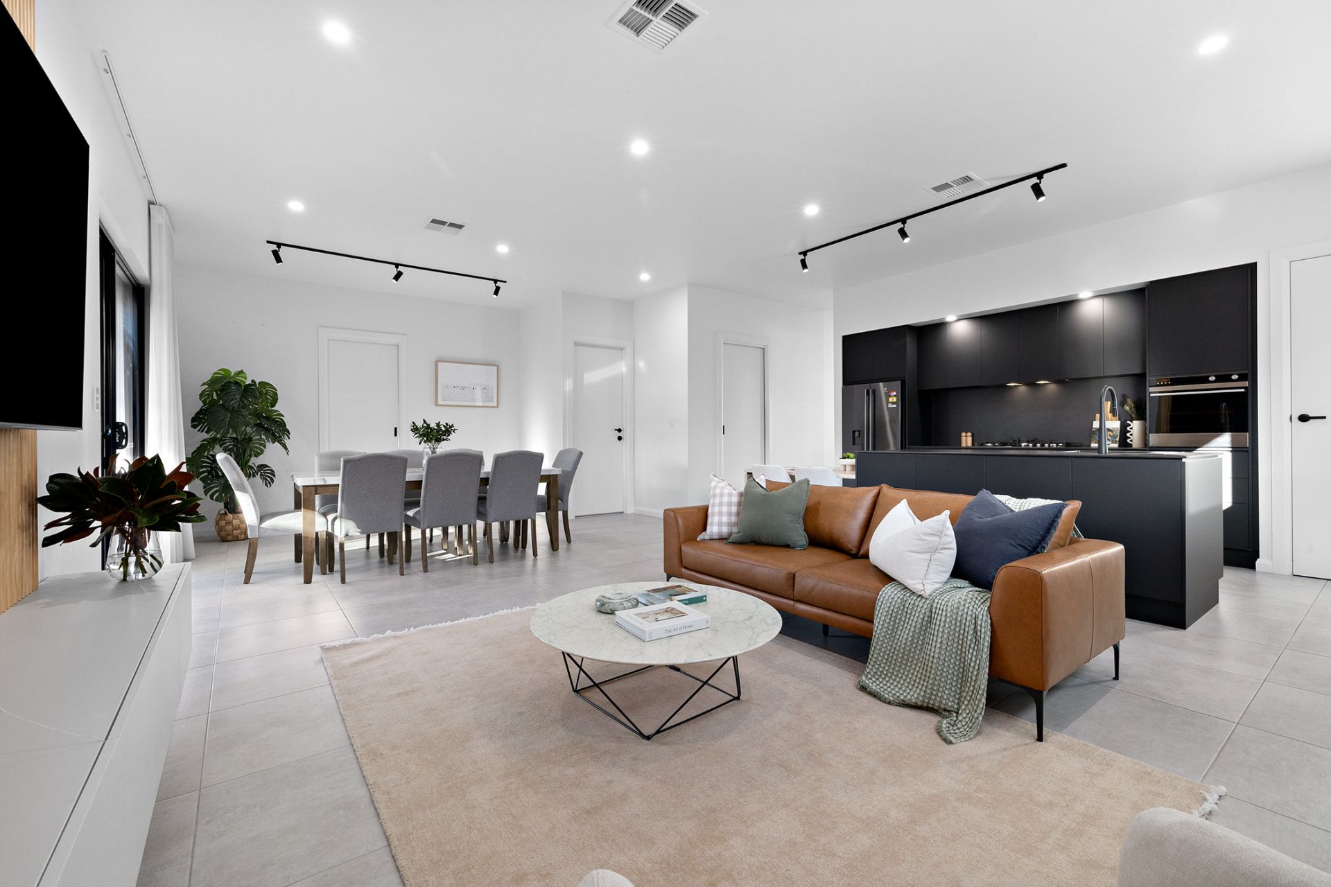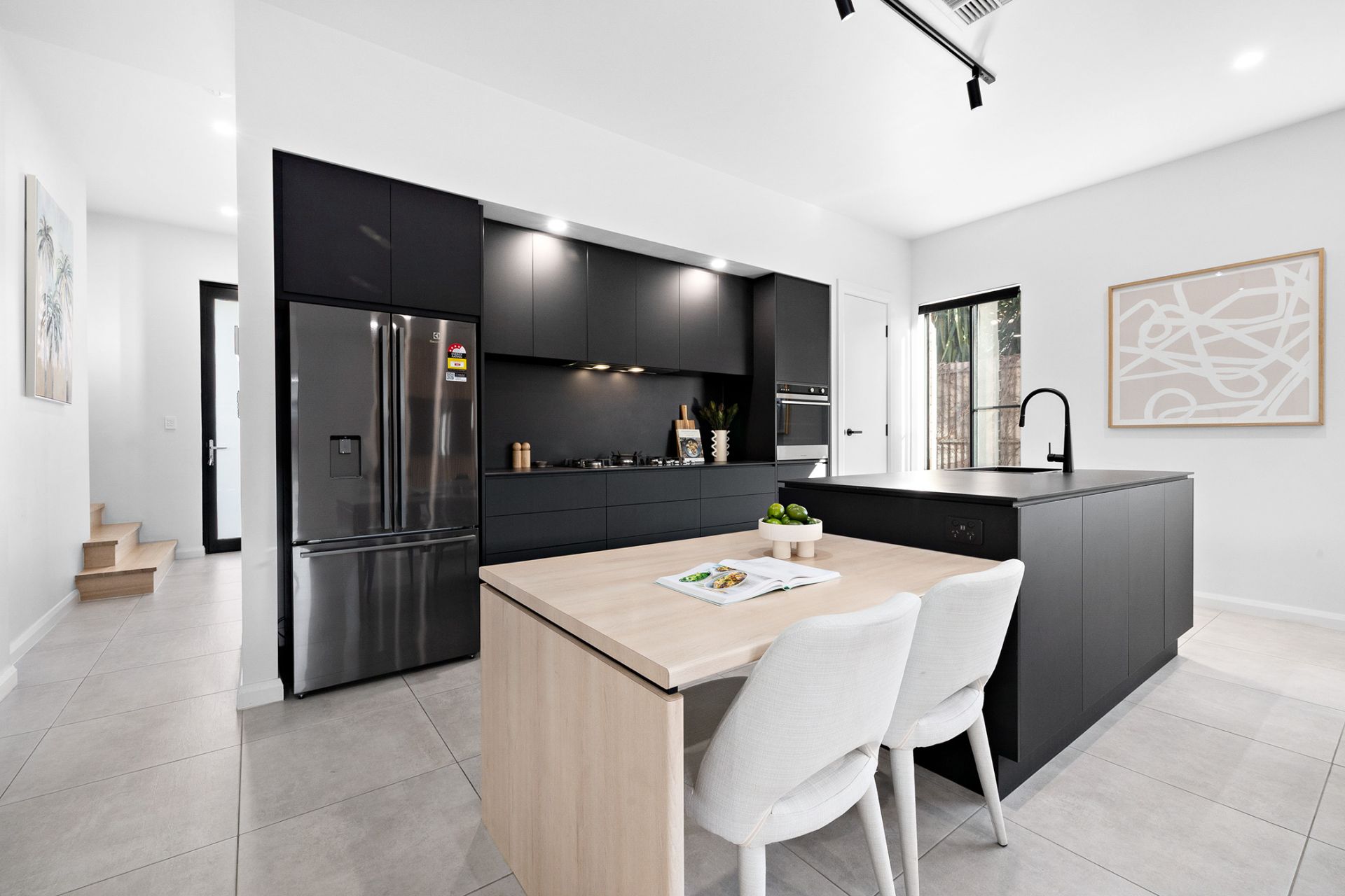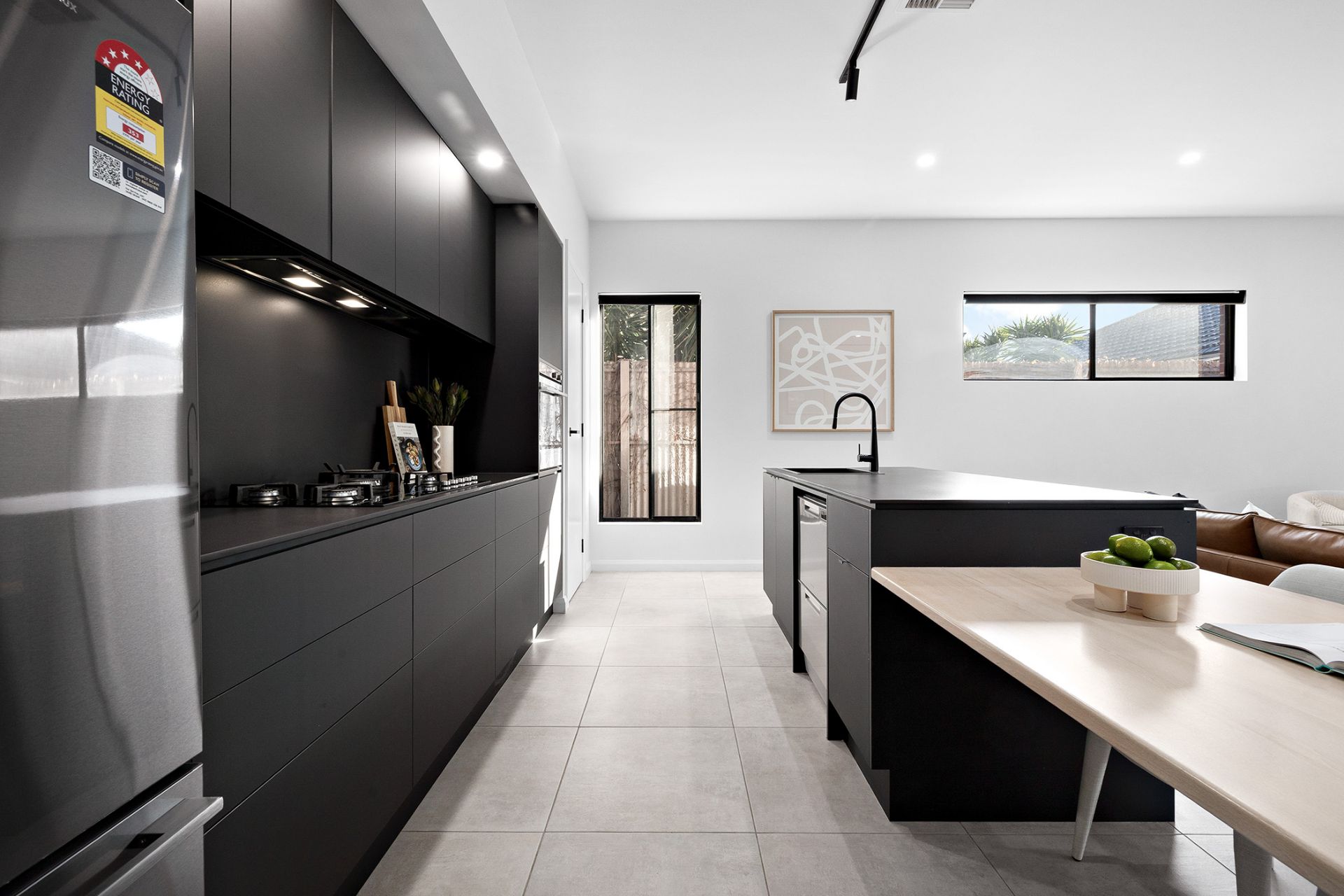 High ceilings and slick tiled floors set the scene for the undoubted star here; a dramatic black kitchen with quality appliances, gas cooktop, breakfast bar, dishwasher and a walk-in pantry.