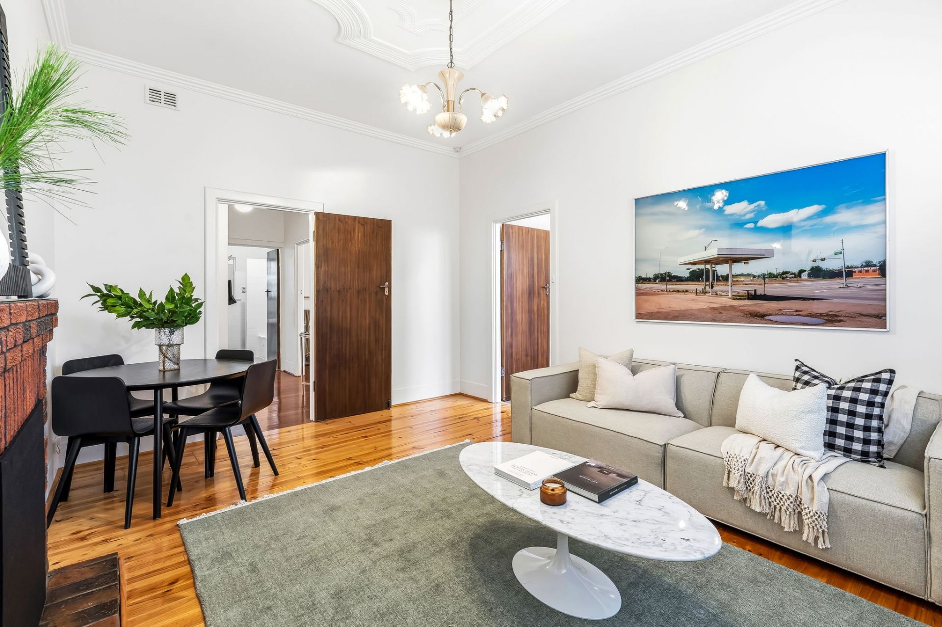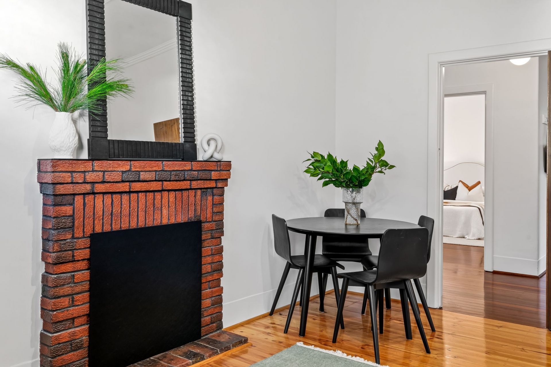 From the charming, covered porch, step into the wide entry that guides you to large, light-filled rooms with 3 metre ceilings. Ornate cornicing and ceiling roses add charm and character to the living room, with an original fireplace.