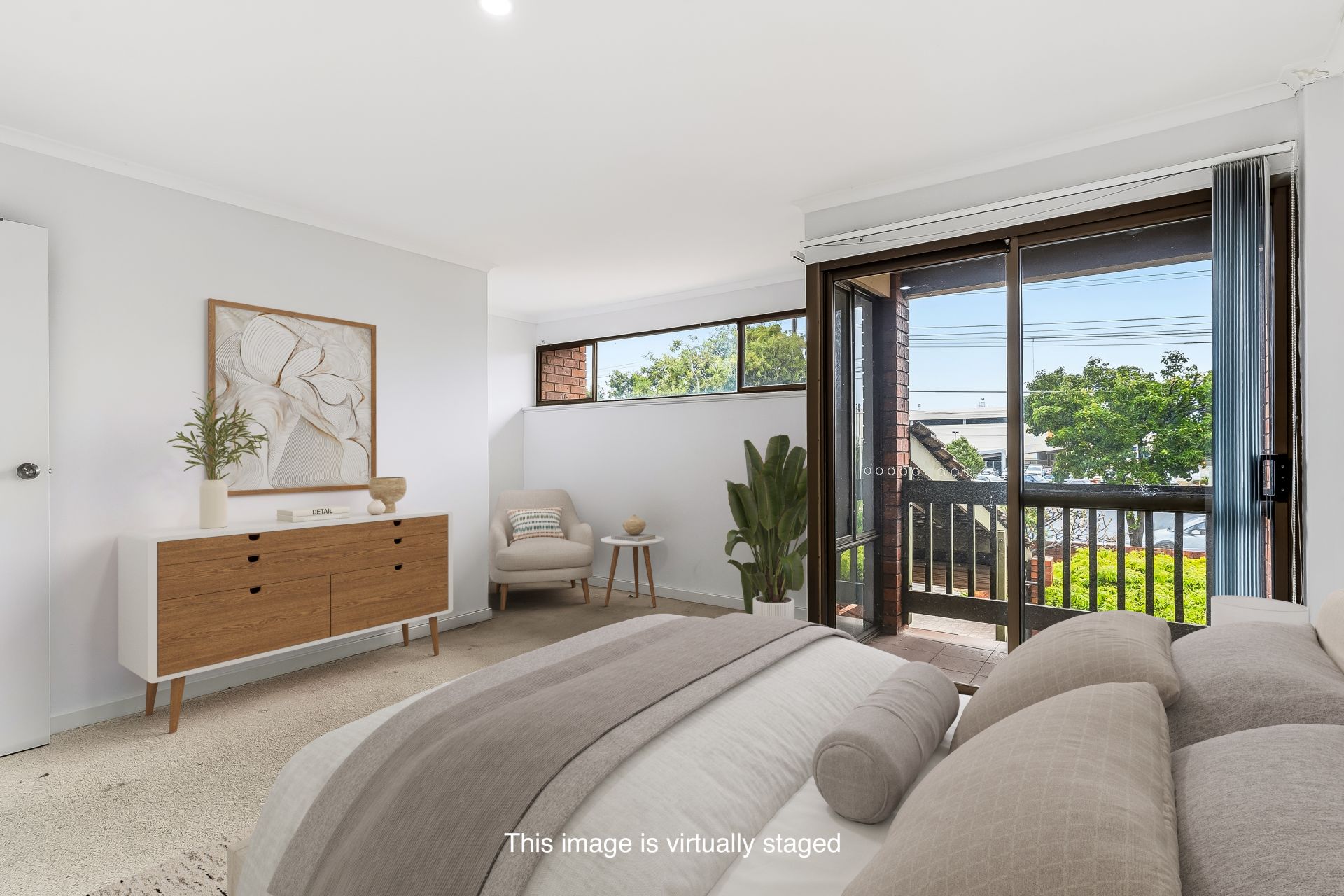 Rest is reserved for an upper level featuring the main bathroom and two bedrooms, including a spacious master with built-in robes and a private balcony. Bedroom two would also make a great home office.