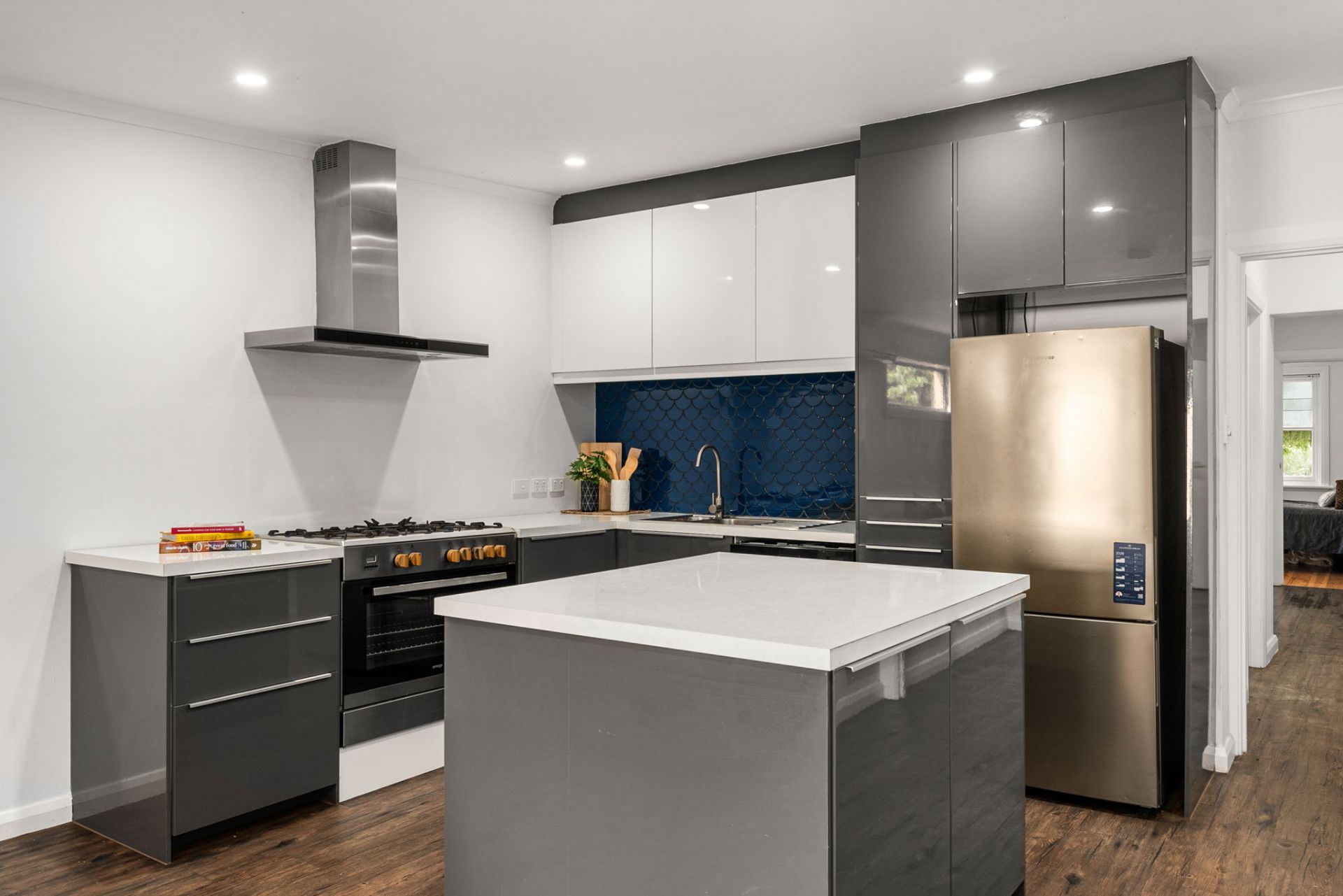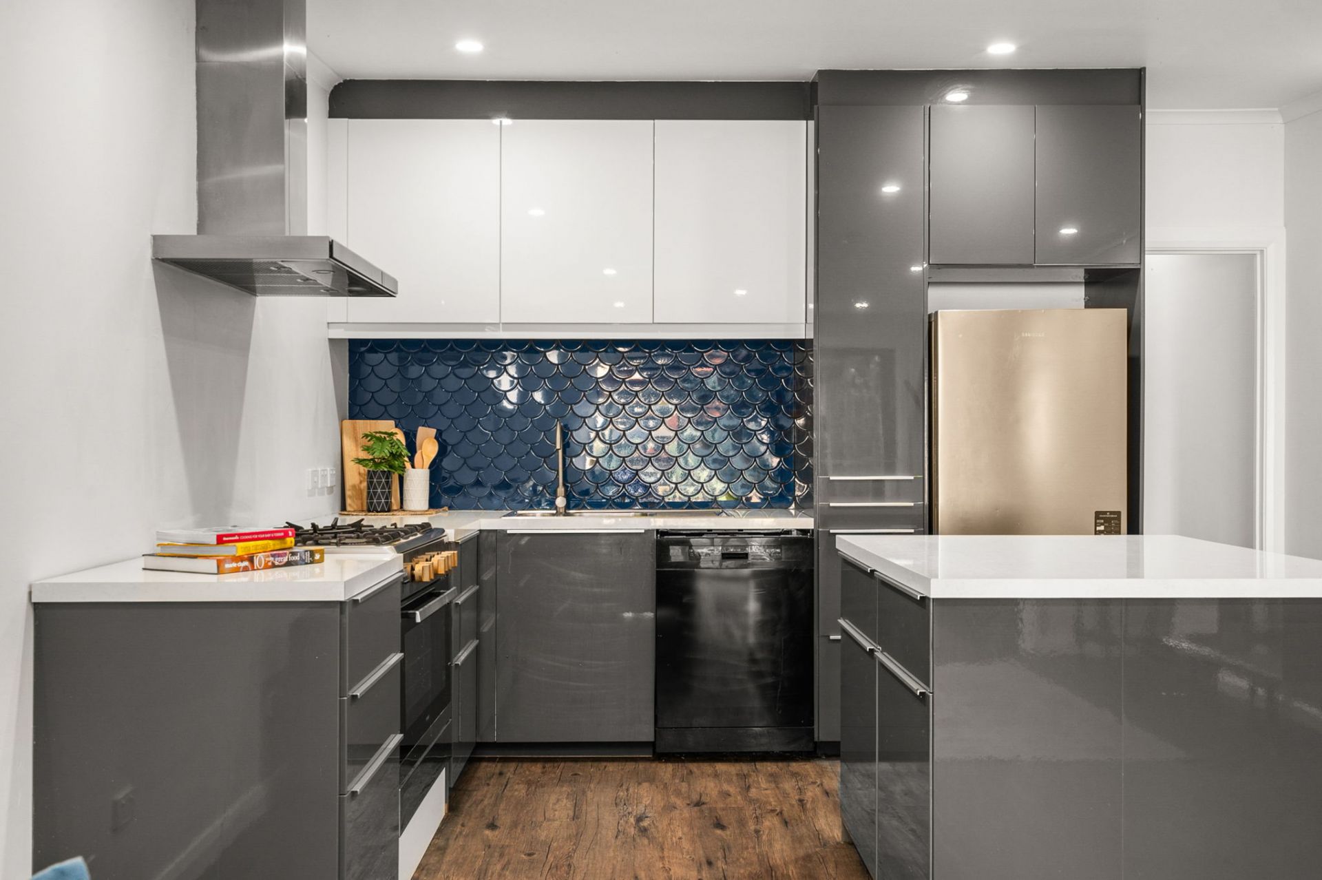 Compact but confident, the kitchen uses smart storage, clean joinery, oversized appliances and a statement splashback to punch above its footprint.