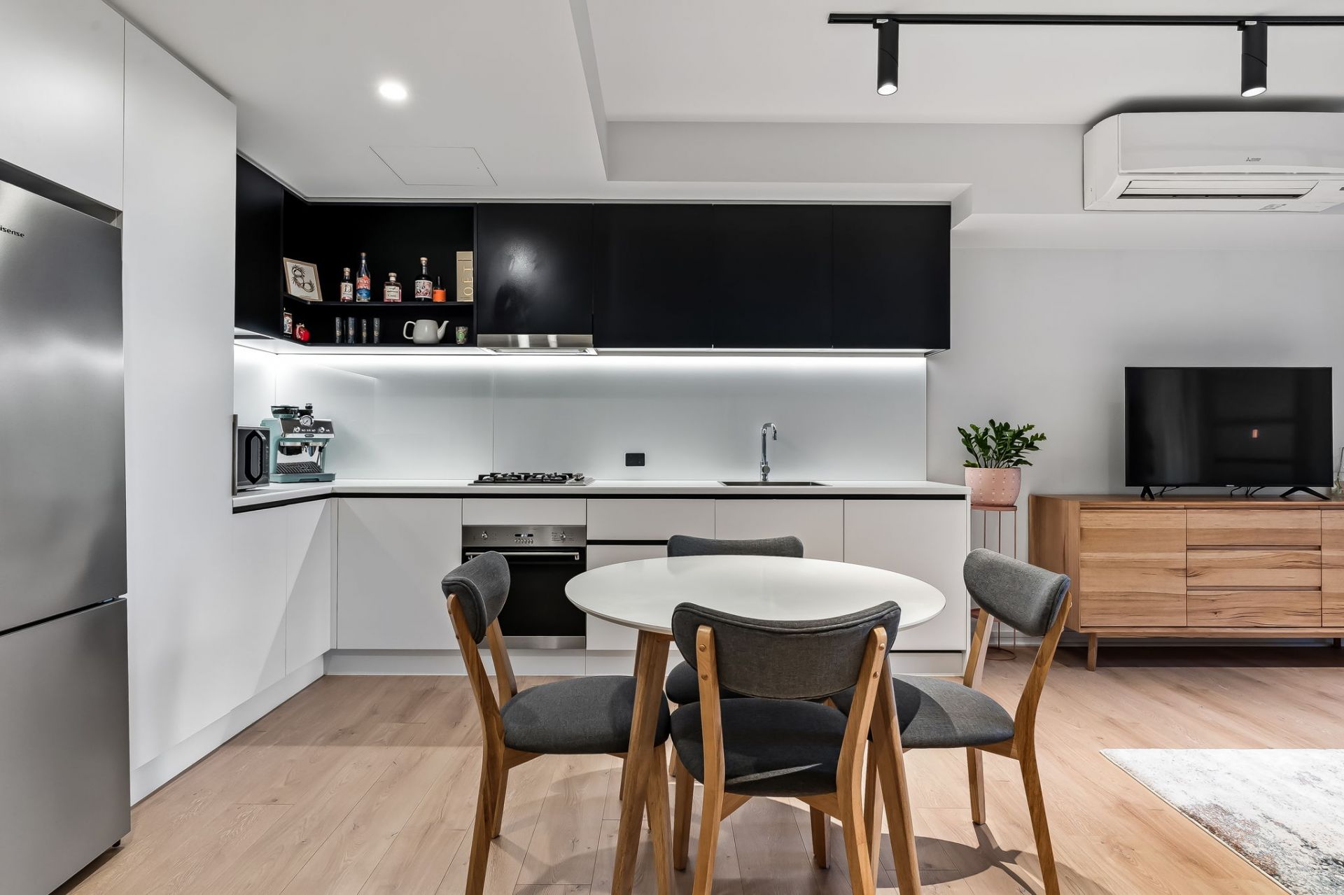 The kitchen is clean-lined and grown-up. Matte black overheads, crisp white cabinetry, gas cooking, integrated storage and soft under-cabinet lighting and laminate benchtops included. Dining sits naturally between kitchen and lounge, keeping the whole space social and fluid.