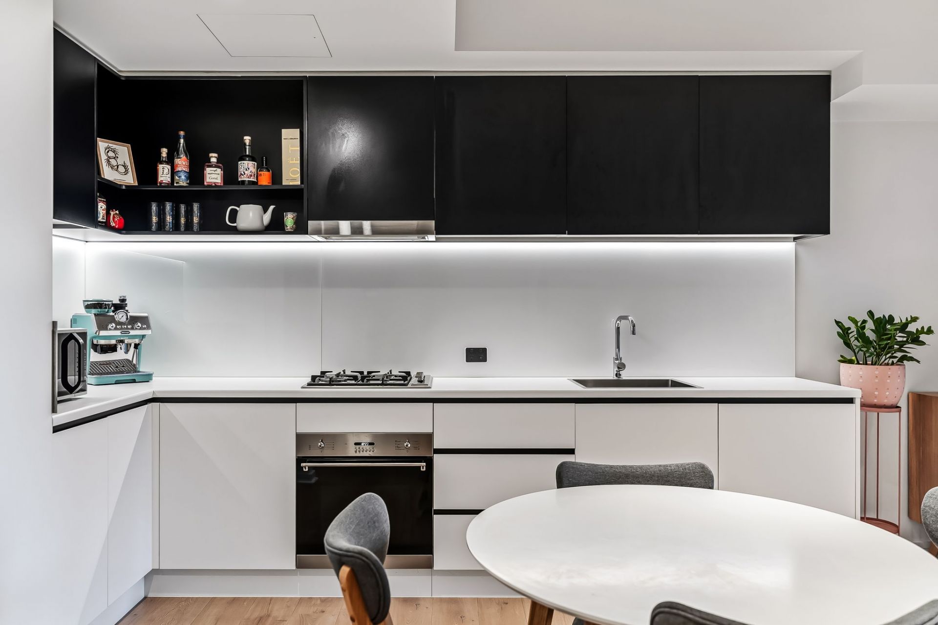• Matte black and white cabinetry with clean lines and under-cabinet lighting