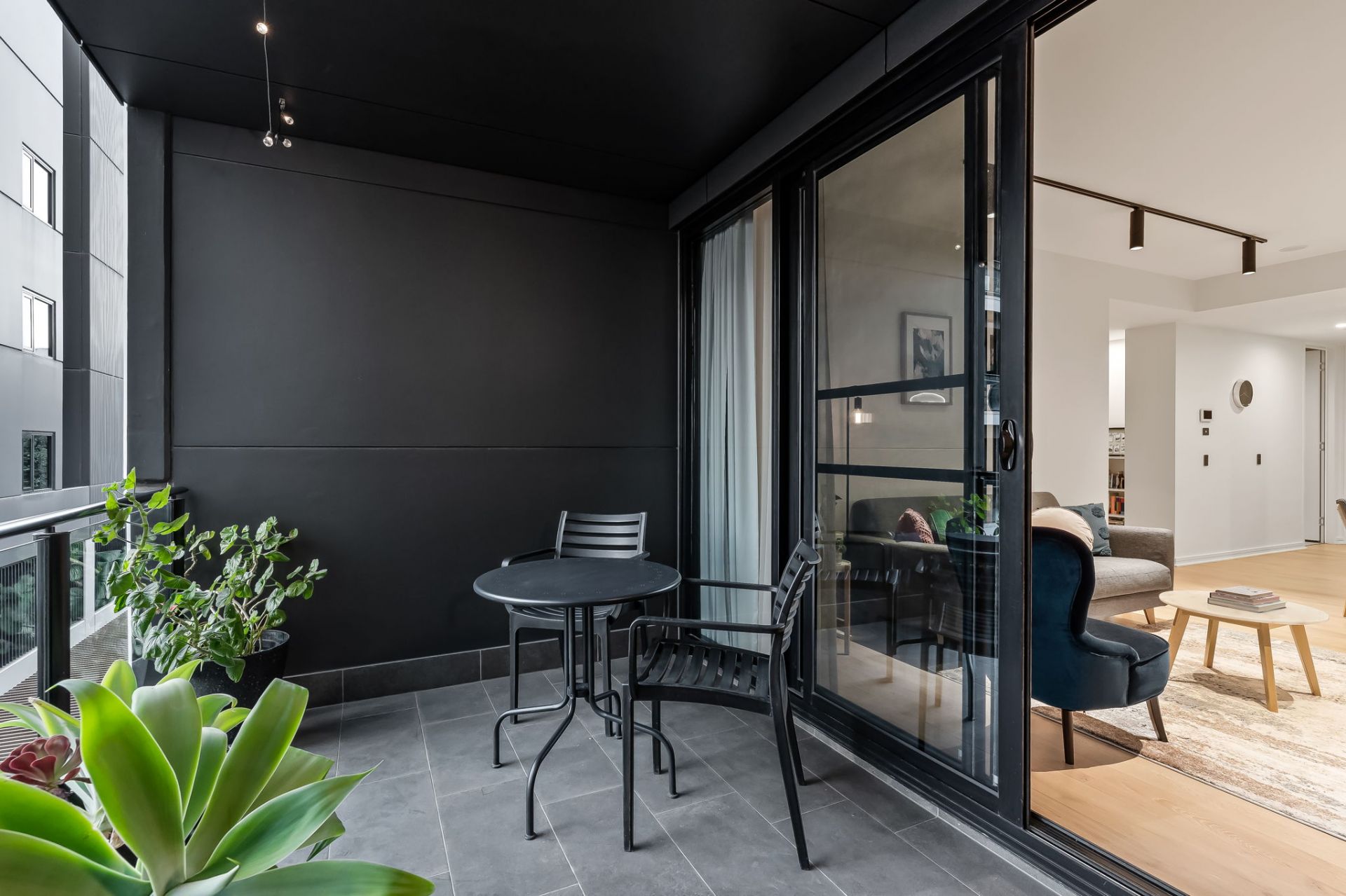 Timber-look floors and track lighting set the tone. Black-framed glazing pulls the outside in and funnels everything toward a terrace balcony that feels more European courtyard that's green-edged and genuinely usable.