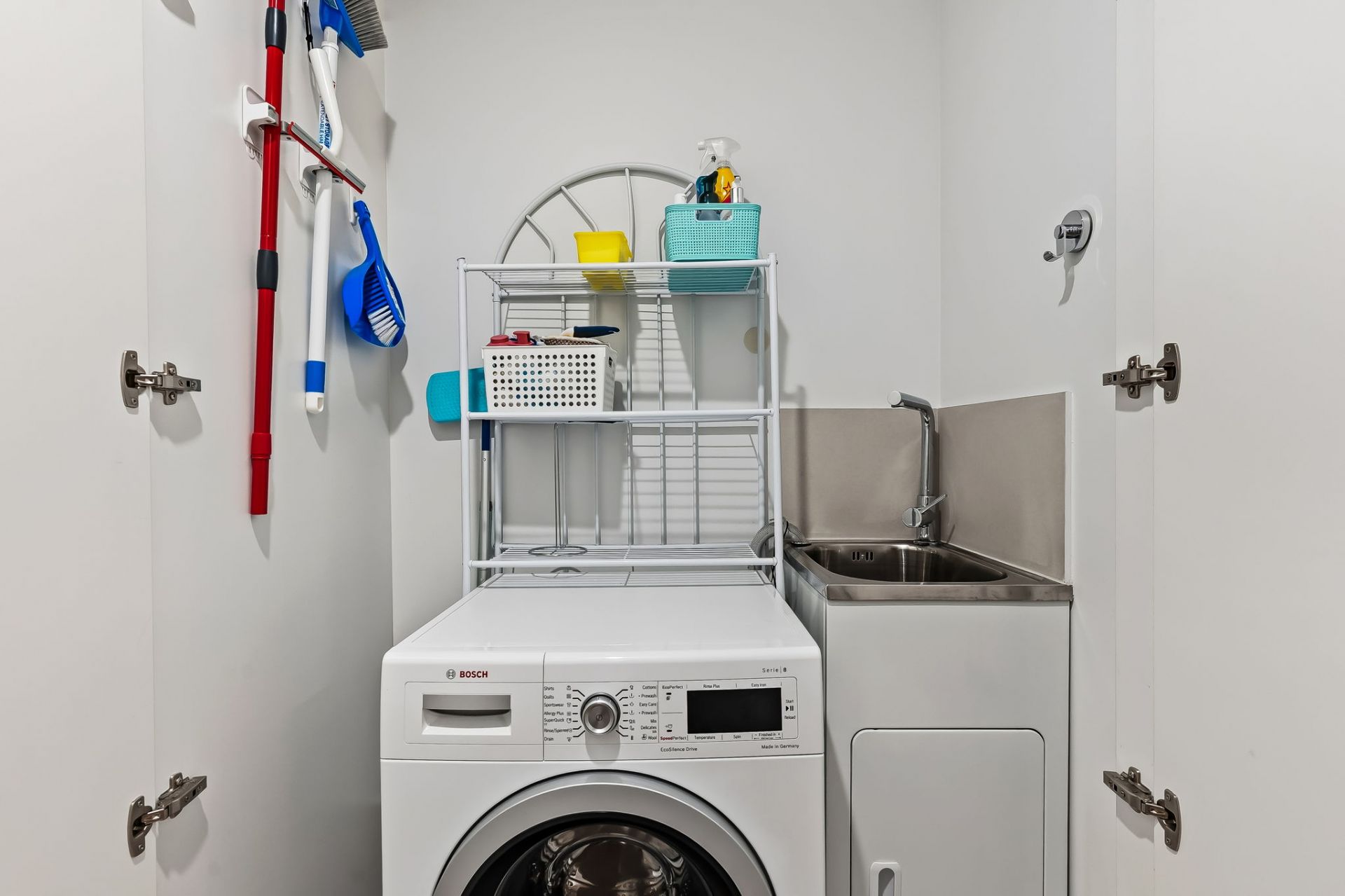 The bathroom continues the same restrained mood with full-height tiling, walk-in shower and a floating vanity, while a concealed European laundry hides away and says goodbye to those annoying trips to the laundromat.