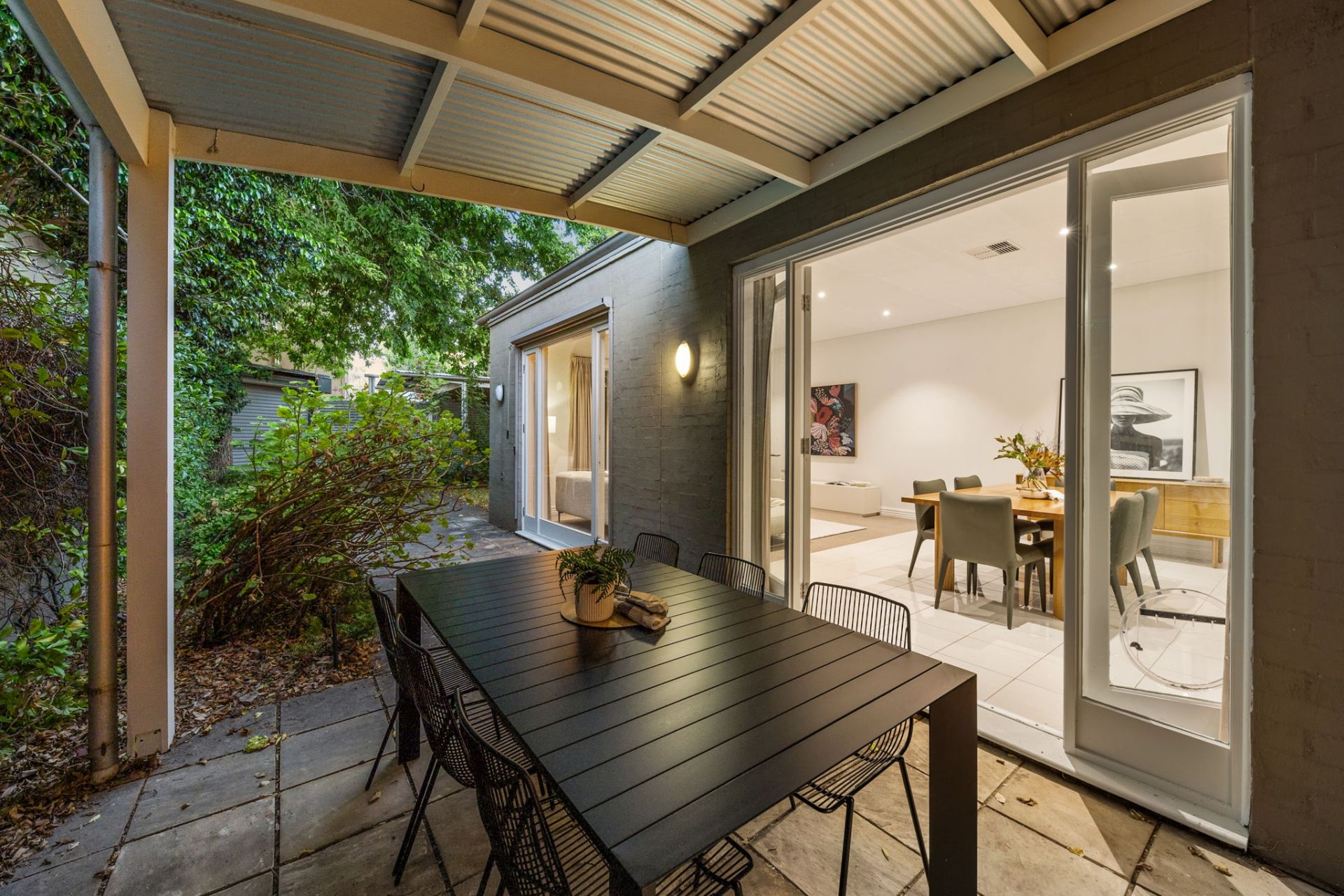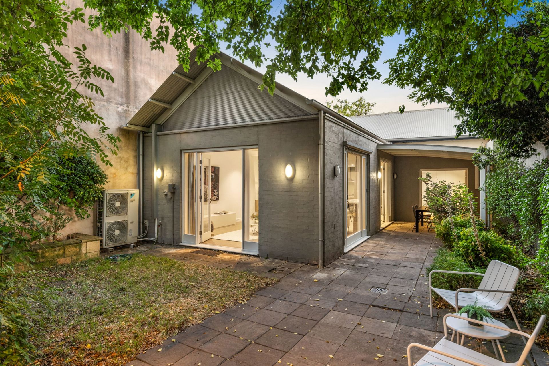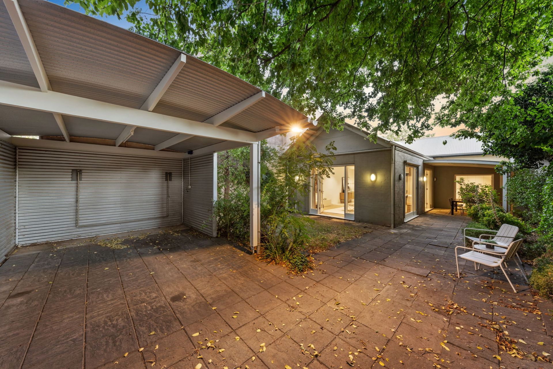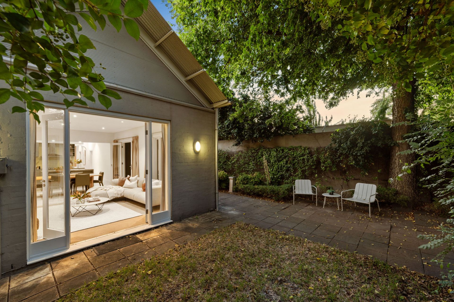 • Private, paved rear courtyard framed by established greenery