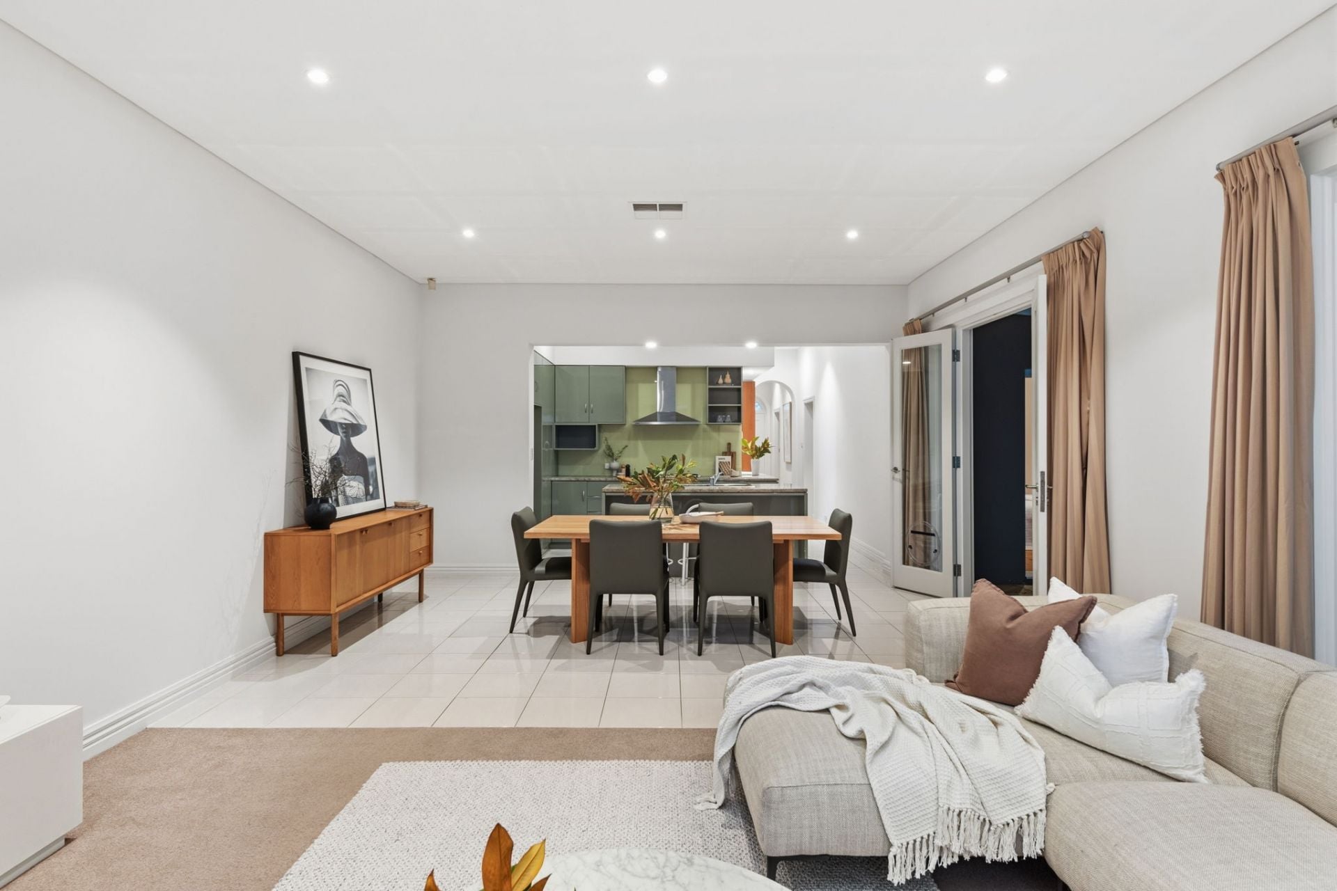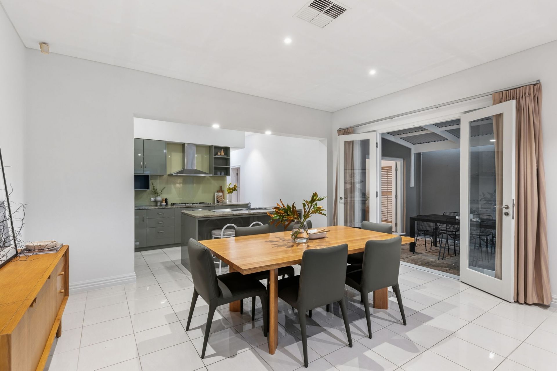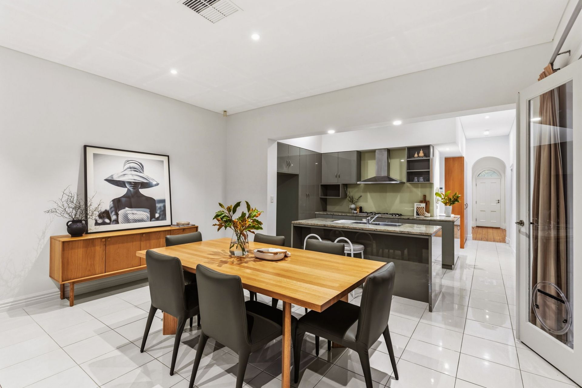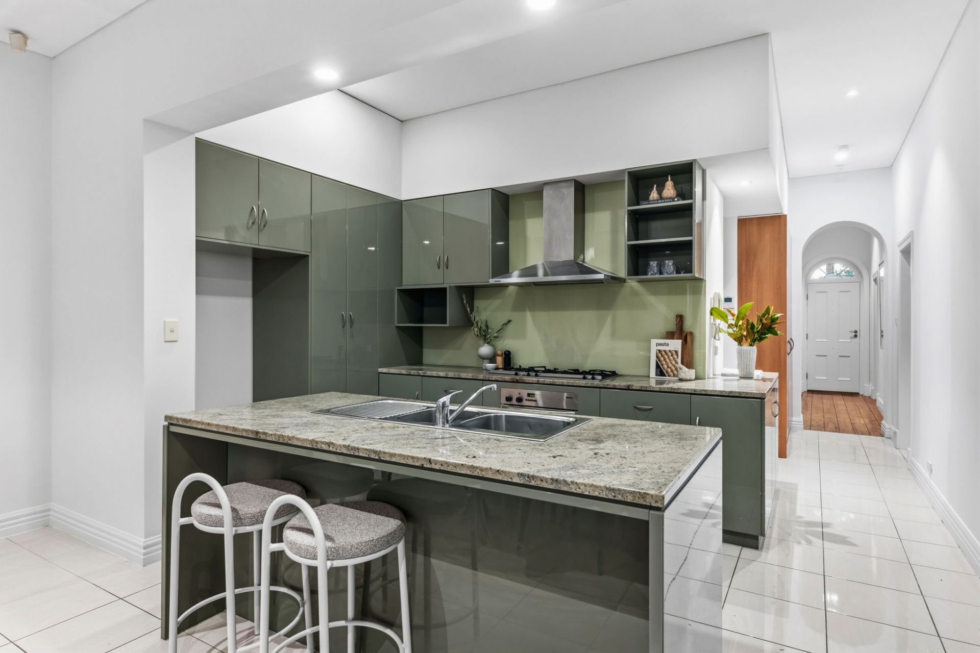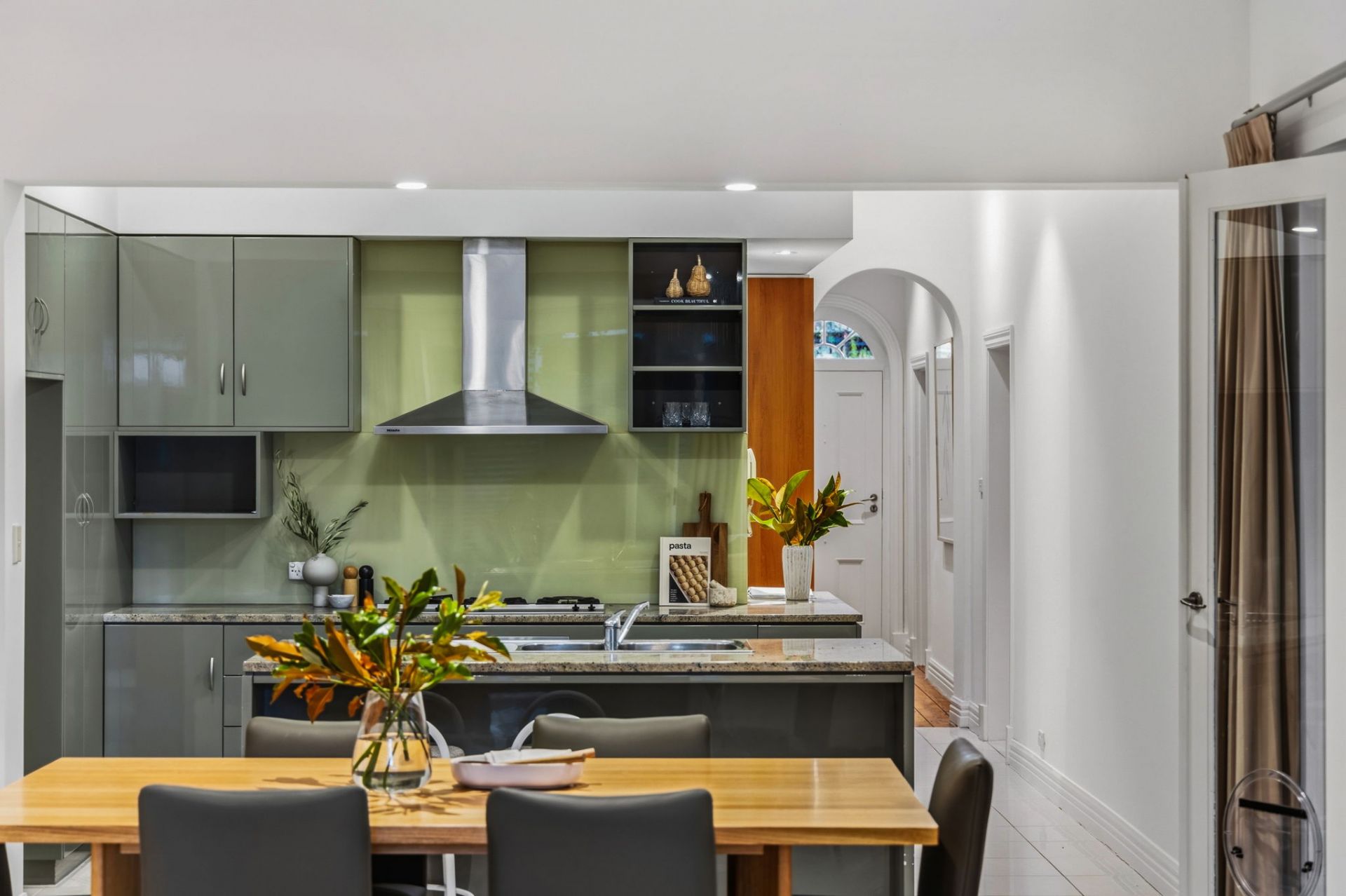 The rear addition shifts the tone entirely. A broad family and meals zone is fed by a gorgeous-in-green, stone-topped kitchen with breakfast bar and quality stainless steel appliances. The social, stylish hub.