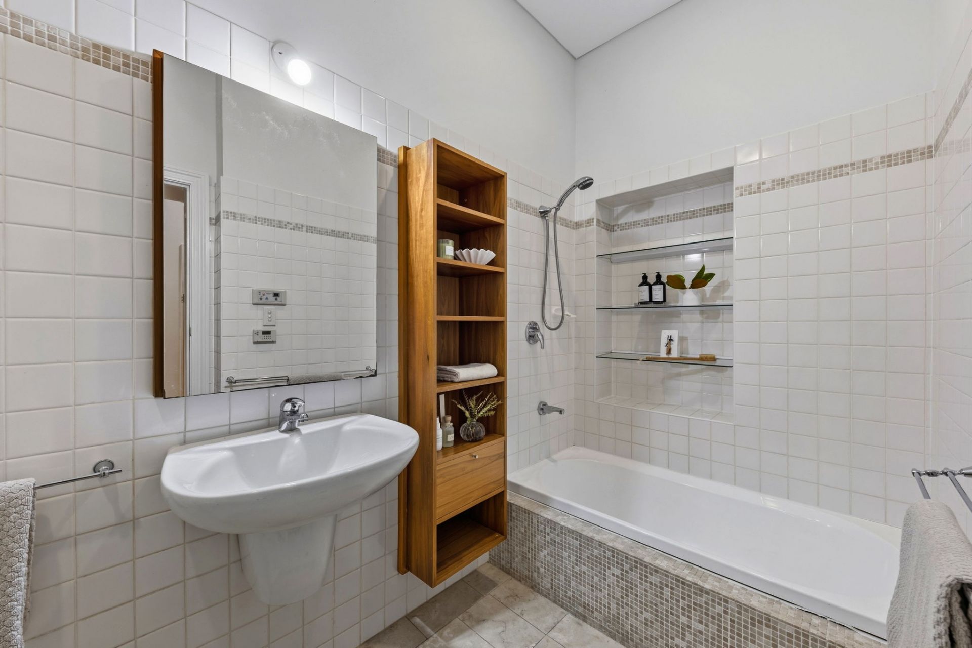 • Neat central bathroom with separate bath and shower, plus integrated laundry