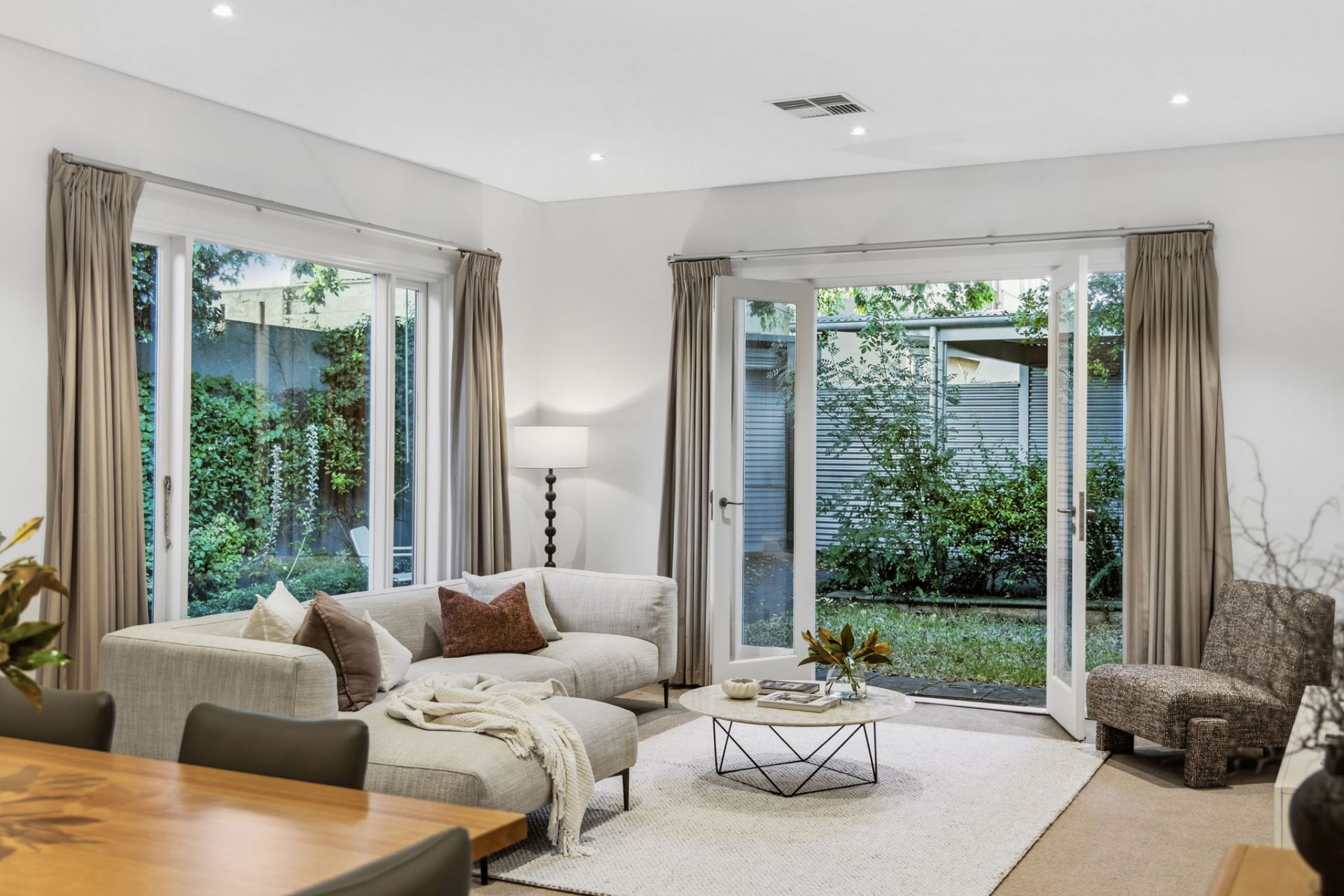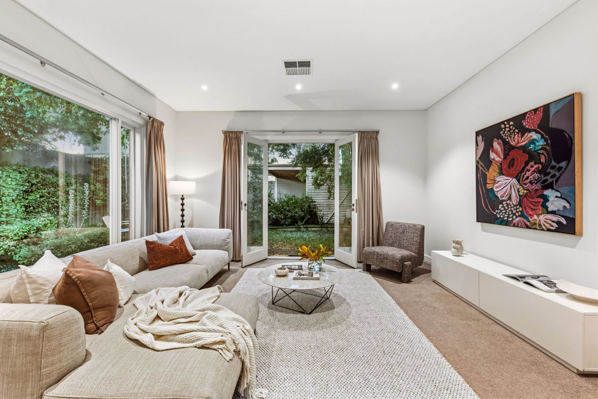 • Flexible third bedroom with French doors opening to a private side courtyard