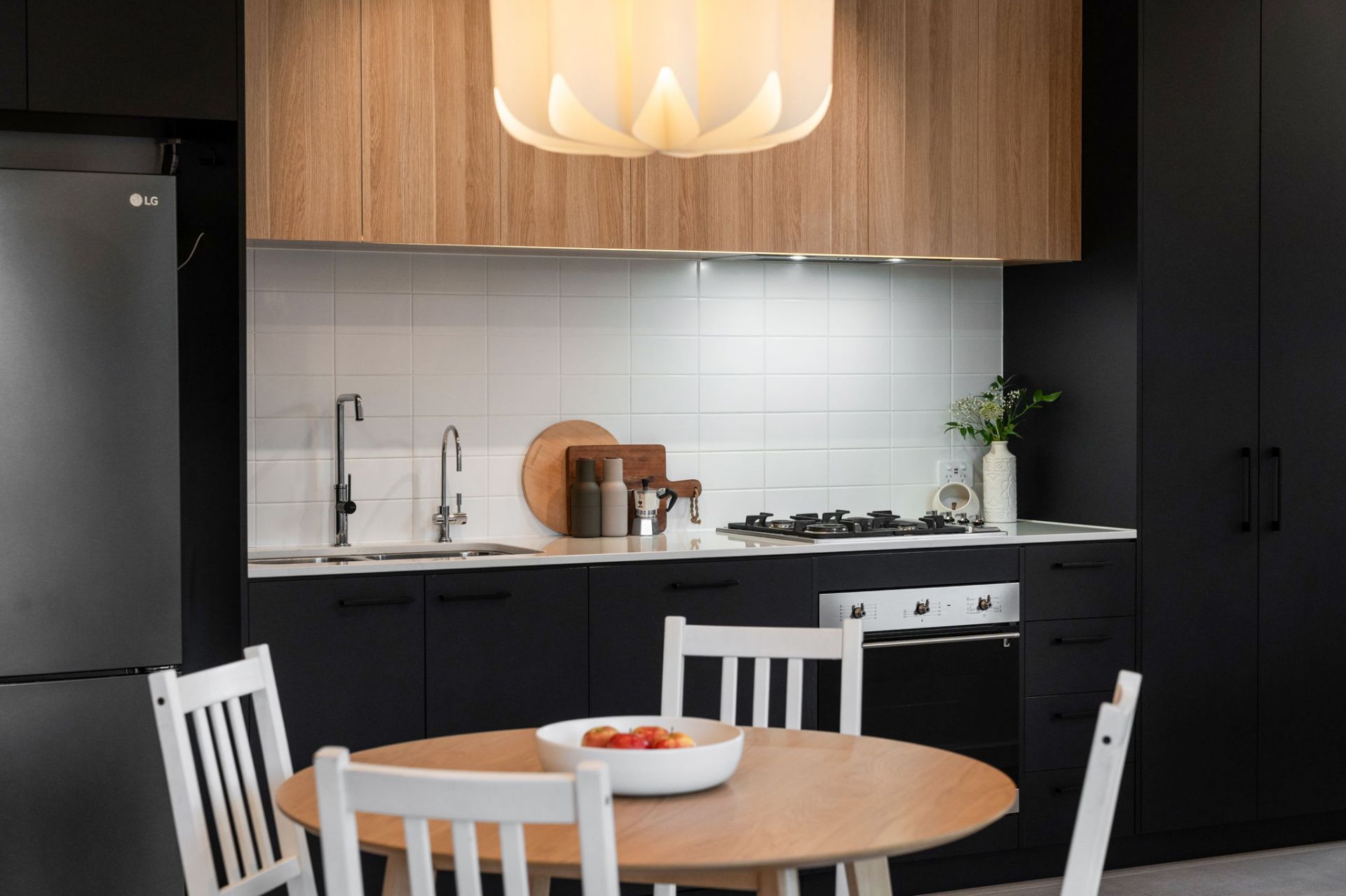 The kitchen keeps things clean and composed with stone benchtops, matte lower cabinetry, timber overhead cupboards, a tall pantry and quality stainless-steel appliances including gas cooktop, electric oven and integrated dishwasher.