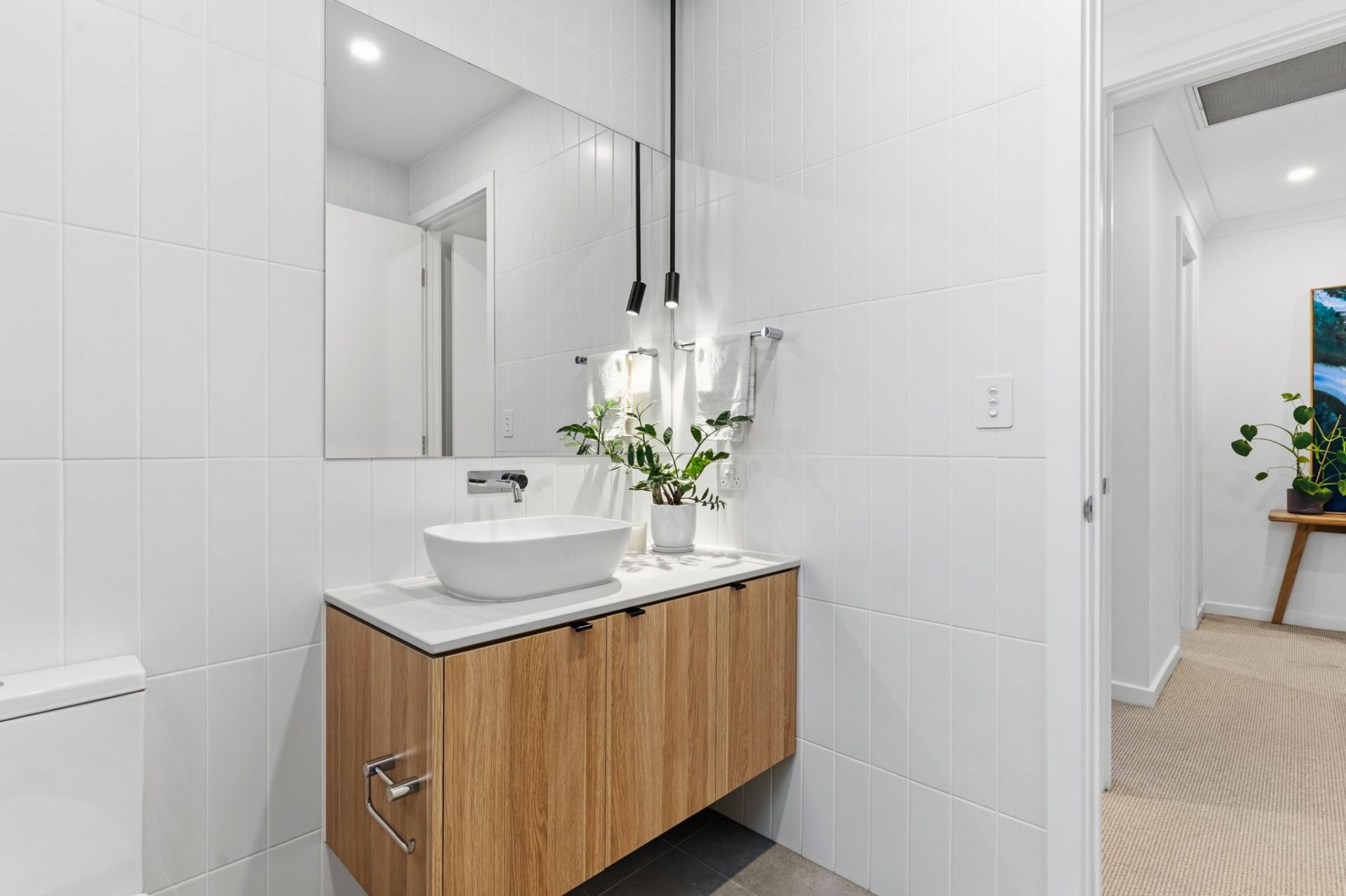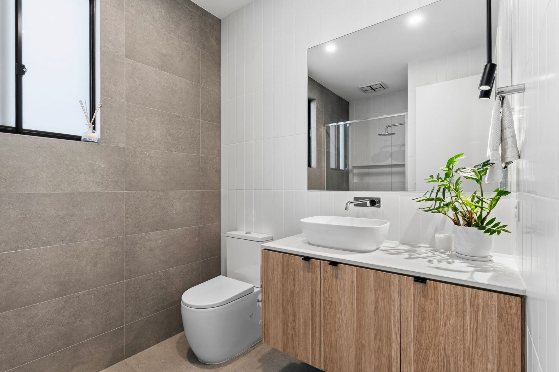 On the top level, the master suite features mirrored robes and a fully tiled ensuite with stone topped vanity and black and chrome fixtures, while the second bedroom and main bathroom continue the same crisp, contemporary detailing.