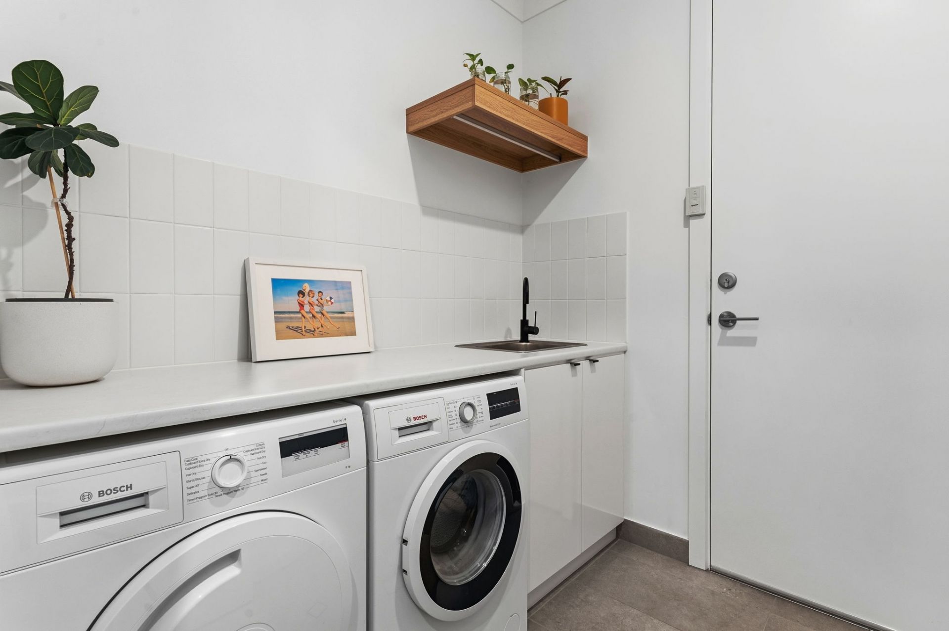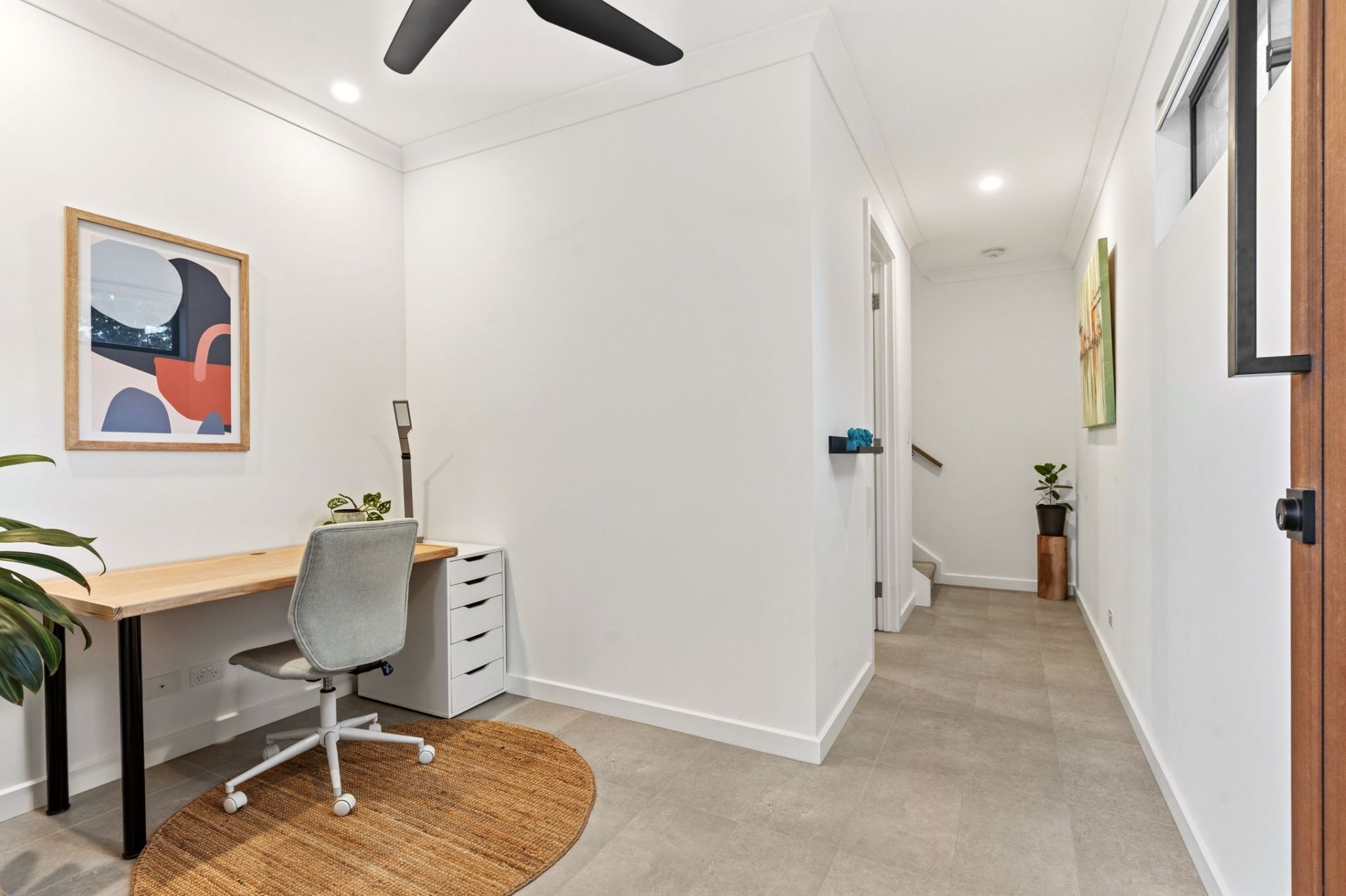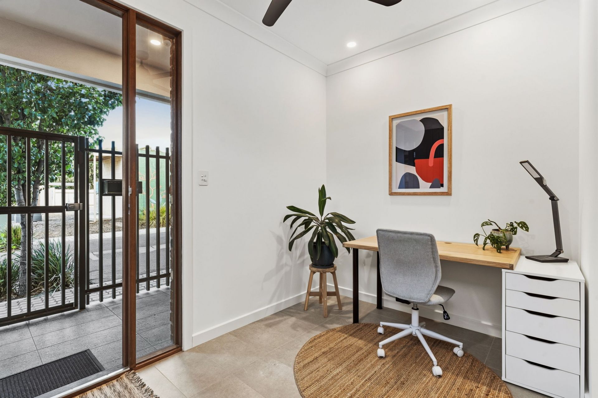 The ground floor establishes a practical base with a dedicated study at the entry, a full laundry with built in storage, and direct internal access to the secure single garage with electric panel lift door.