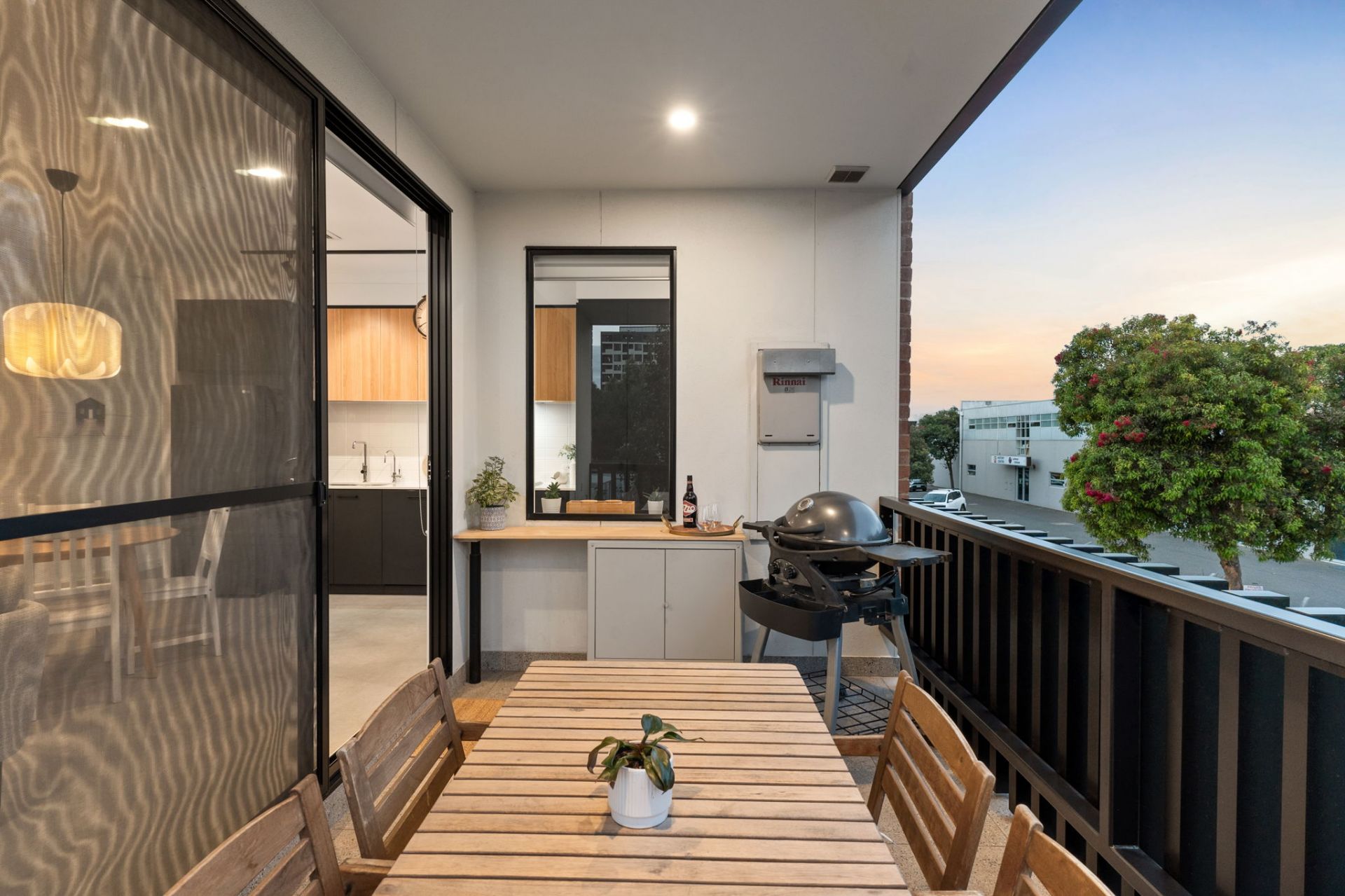 The balcony functions as a natural extension of the living space, capturing morning light and offering an easy vantage point over Bowden's evolving streetscape.