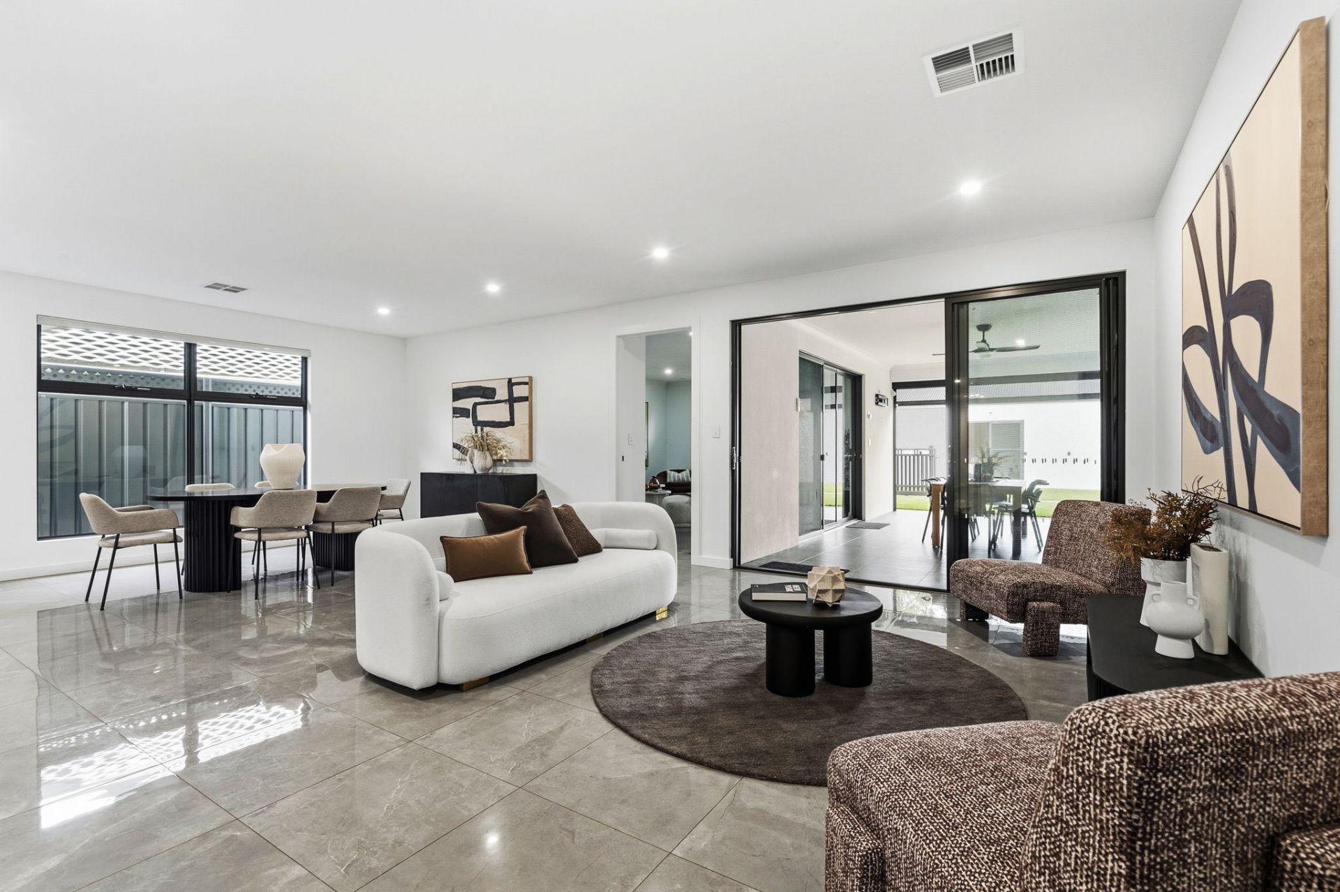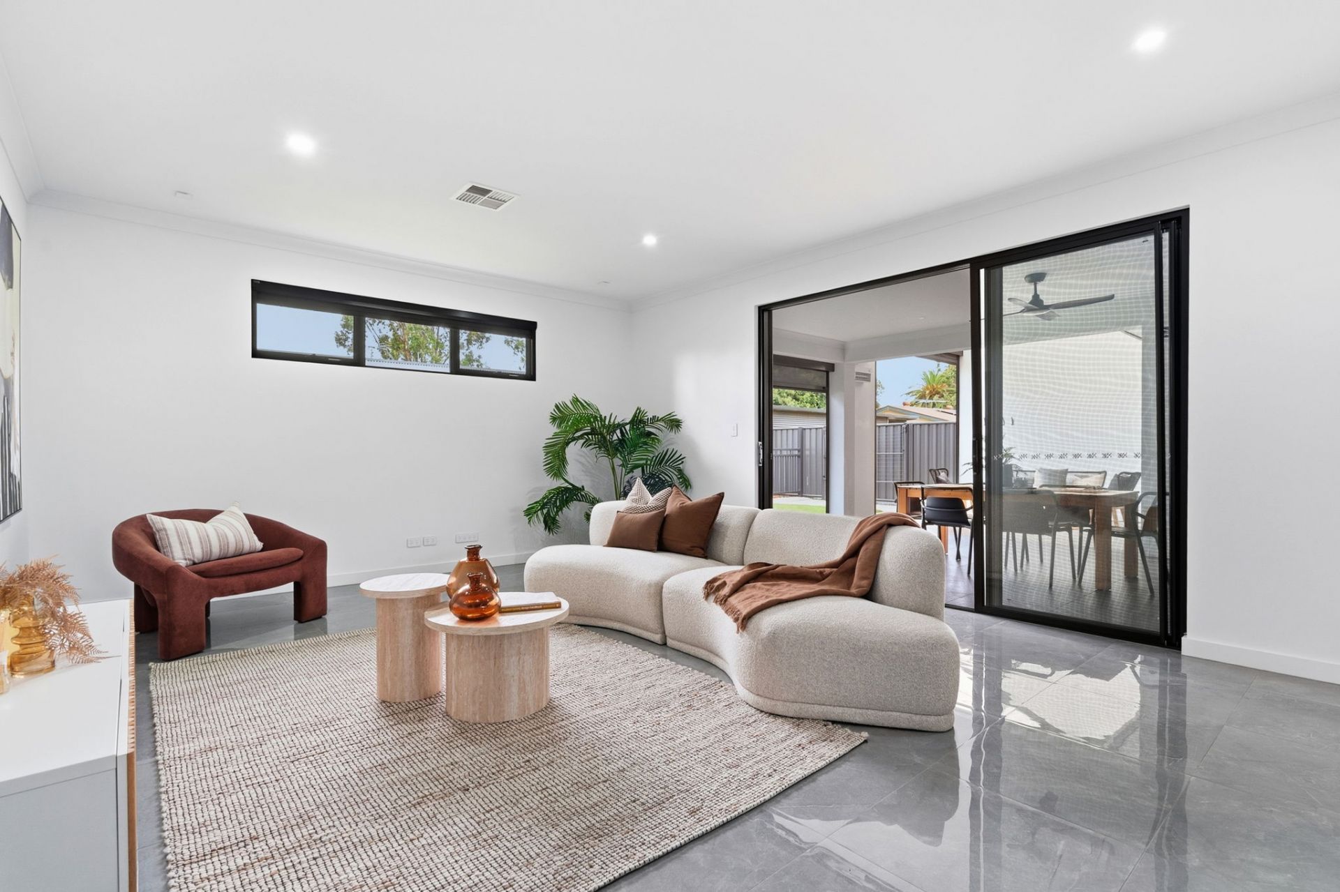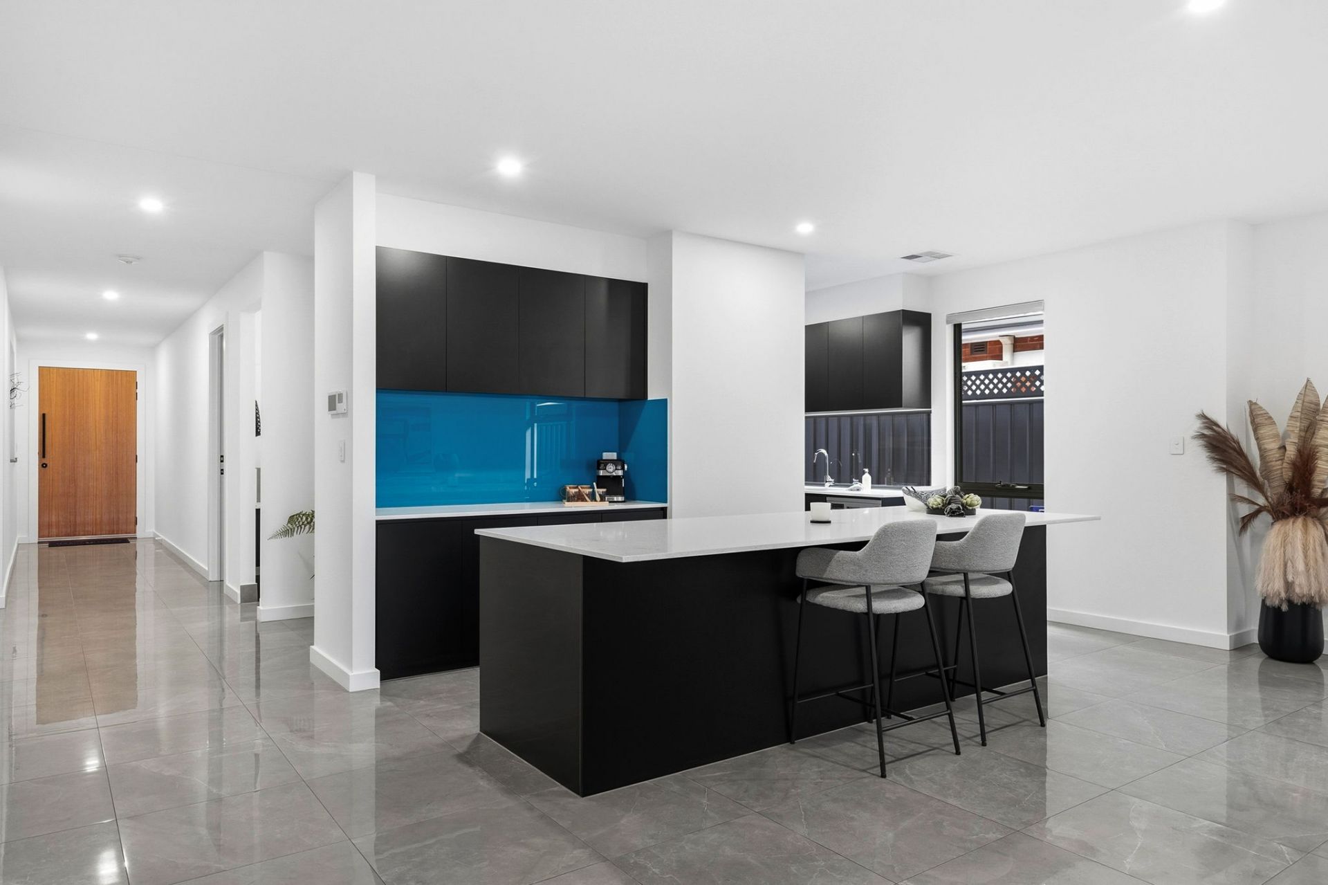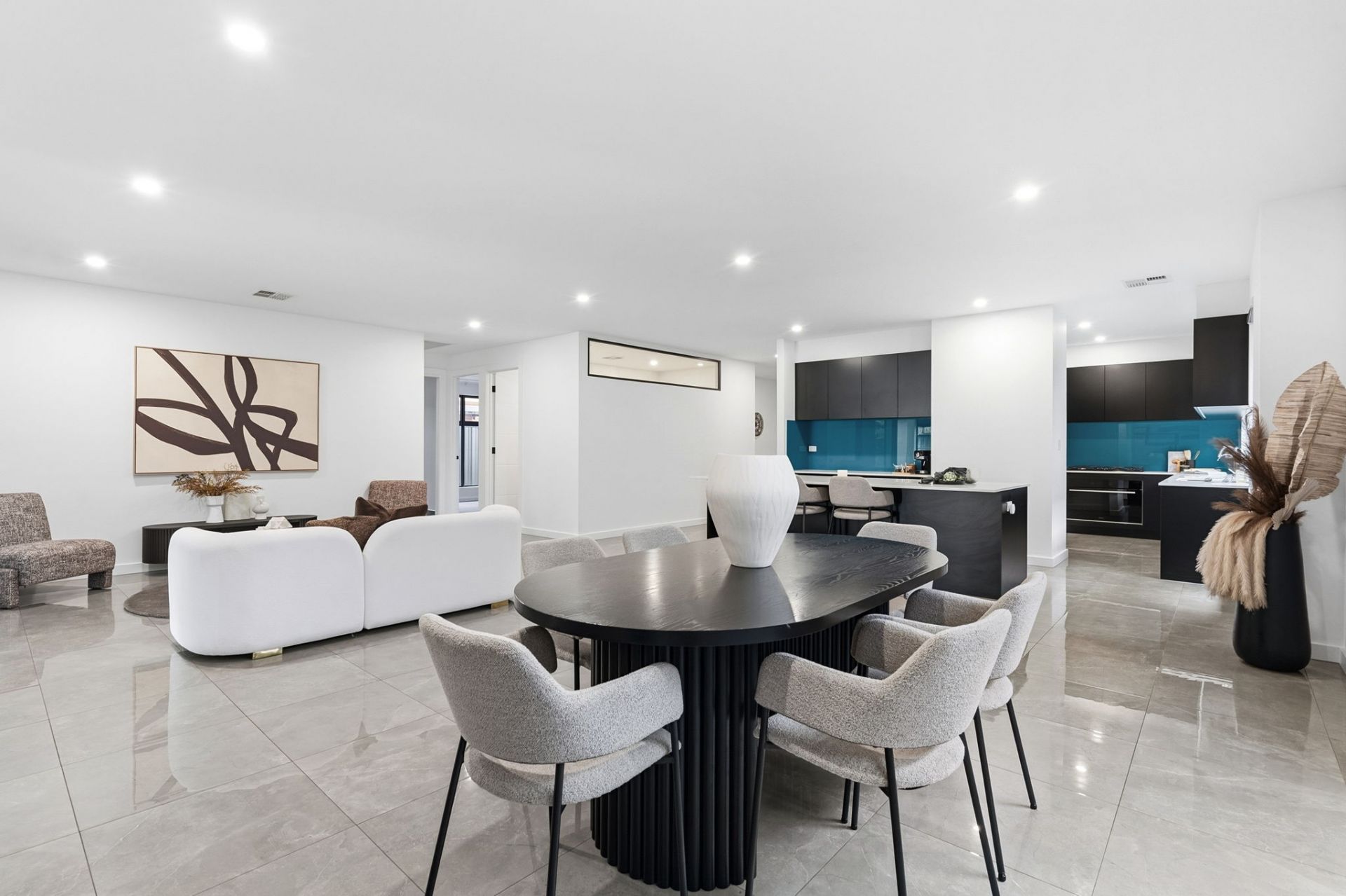 And how house proud you will be, with a frontage and contemporary fencing that welcome you home in security in style. Stepping indoors, gleaming porcelain tiles guide you to the open plan living, the natural heart of family time.