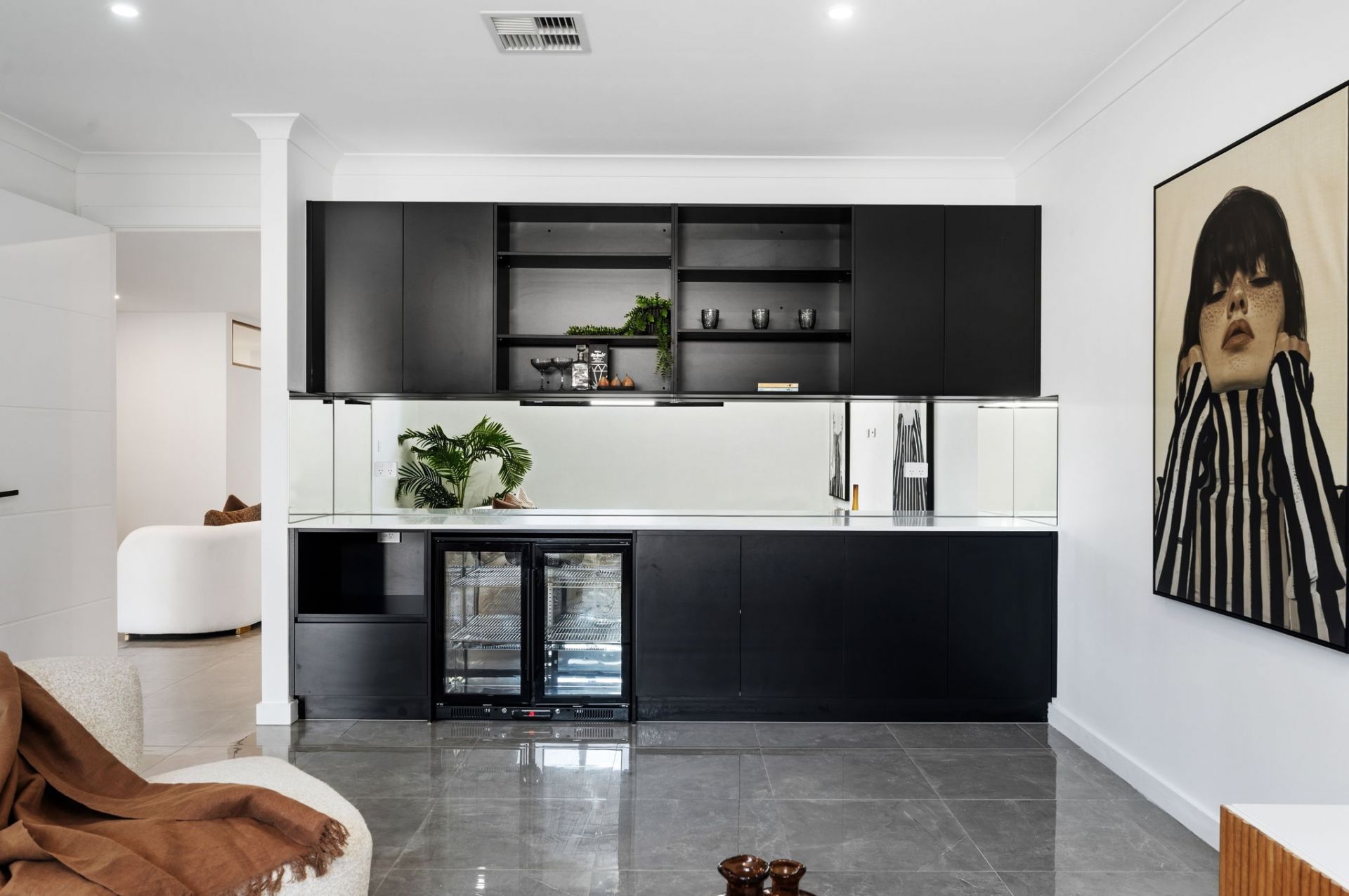 Sliding glass connect both spacious internal living zones to the great outdoors. An impressive bar defines cocktail hour in the lounge, while the all-Aussie dream comes to life across the outdoor entertaining terrace and lawns beyond.