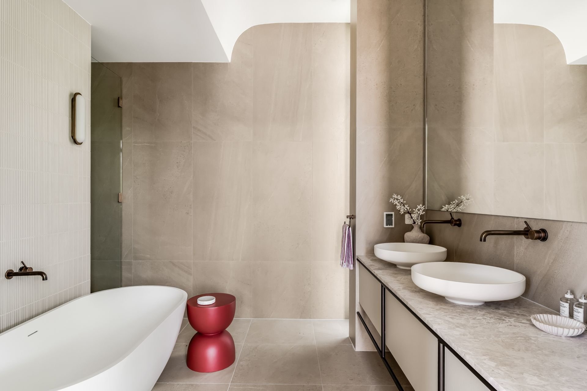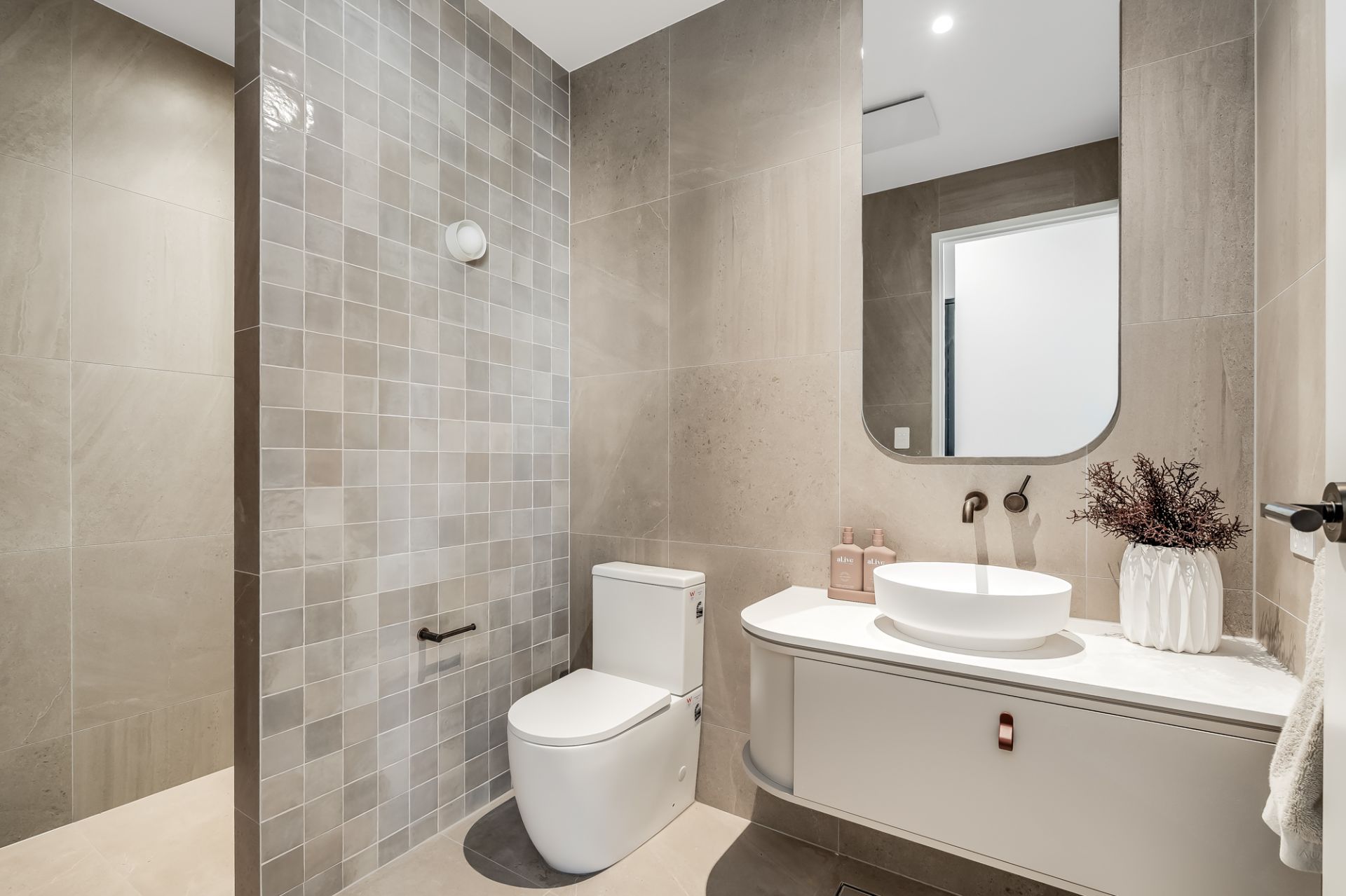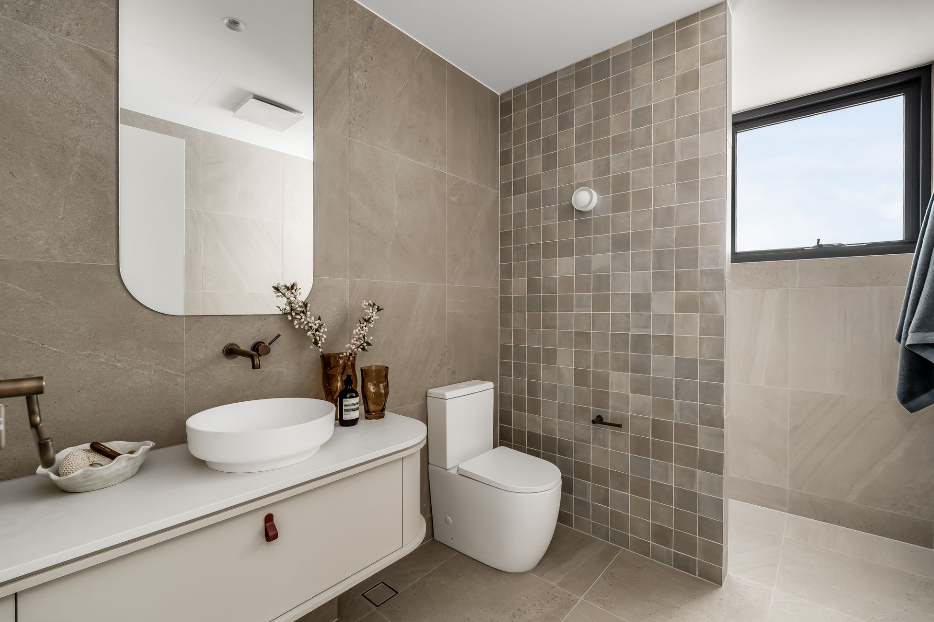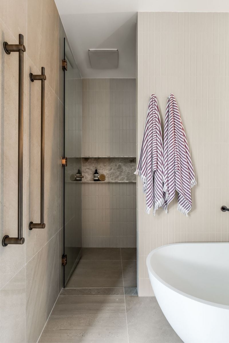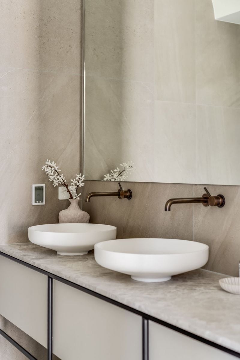 • Antique bronze tapware, soft-close joinery, and full-height mirrors
