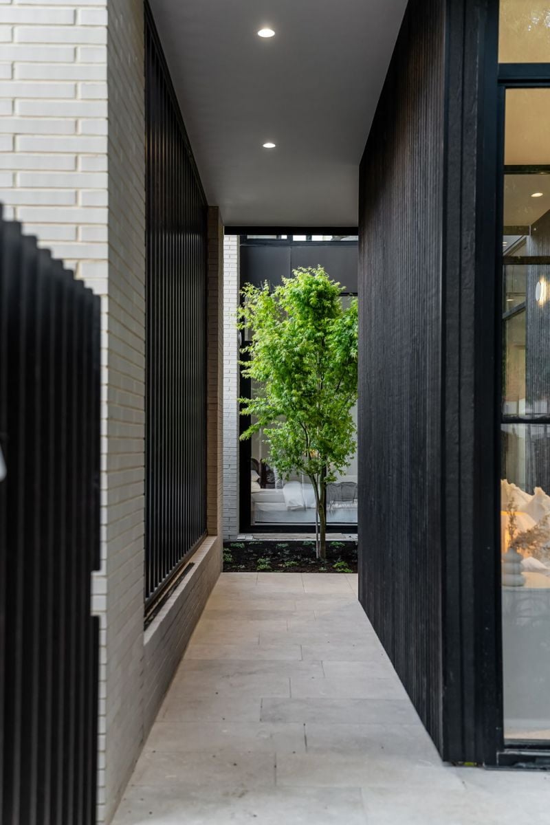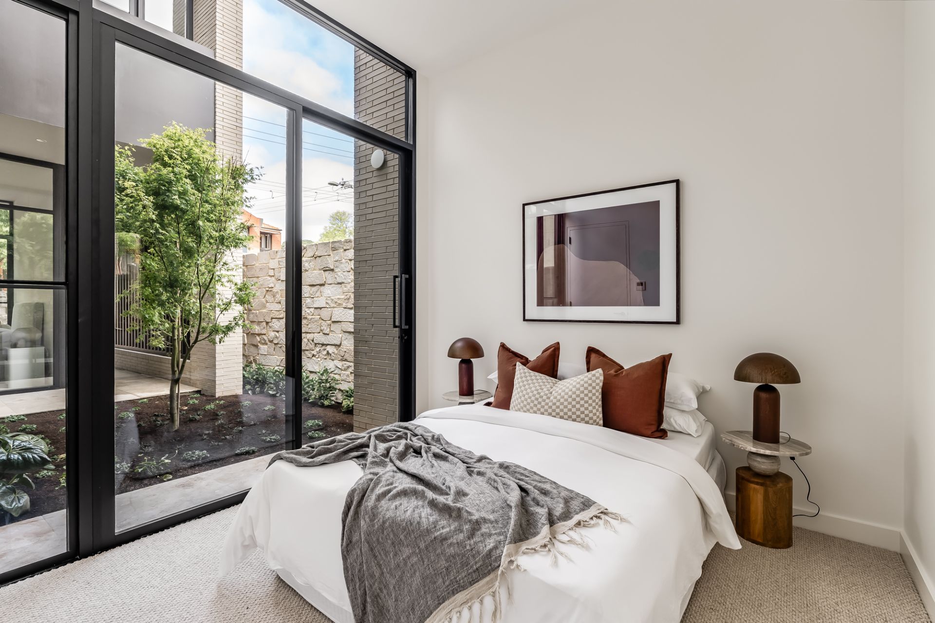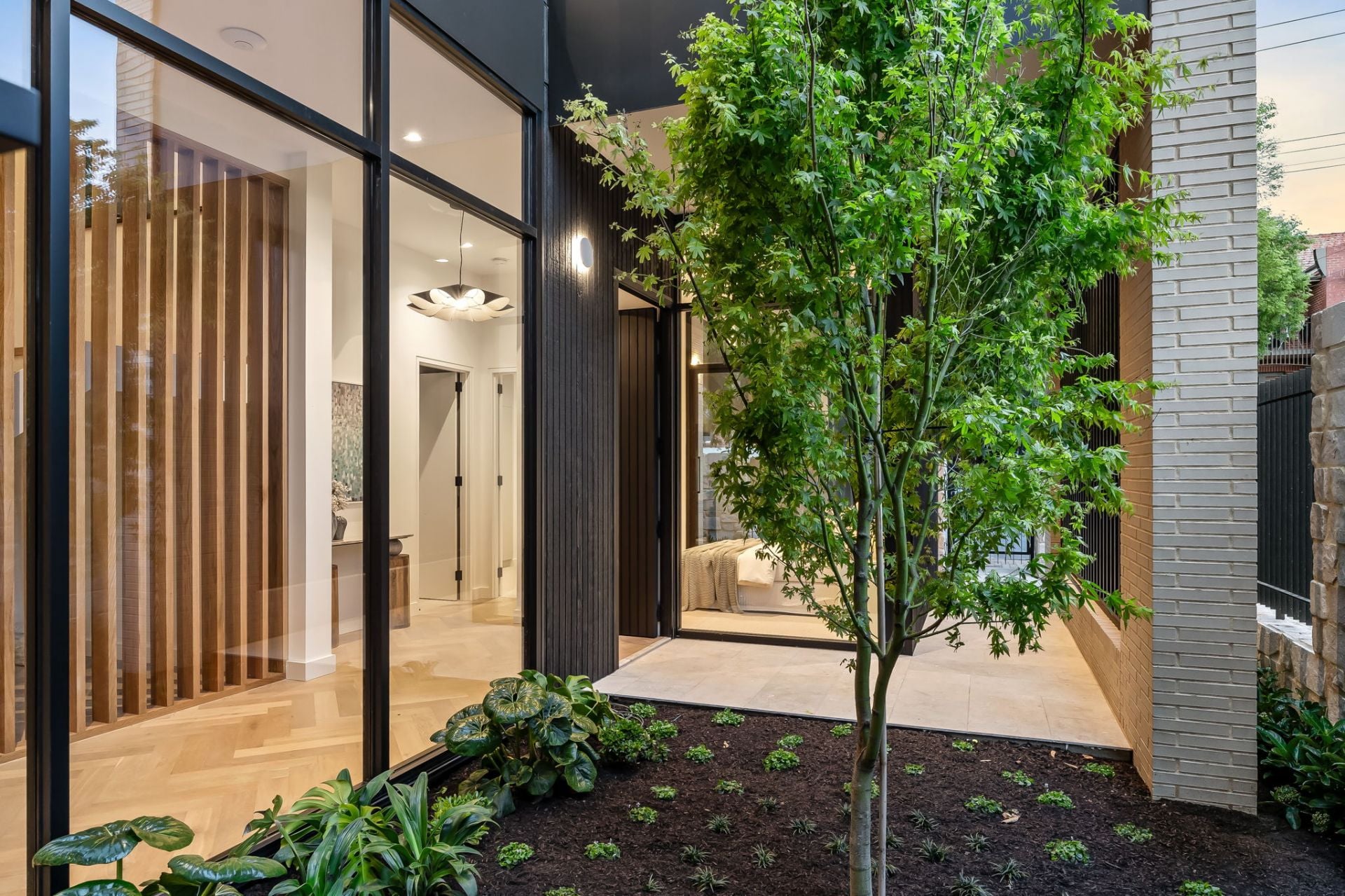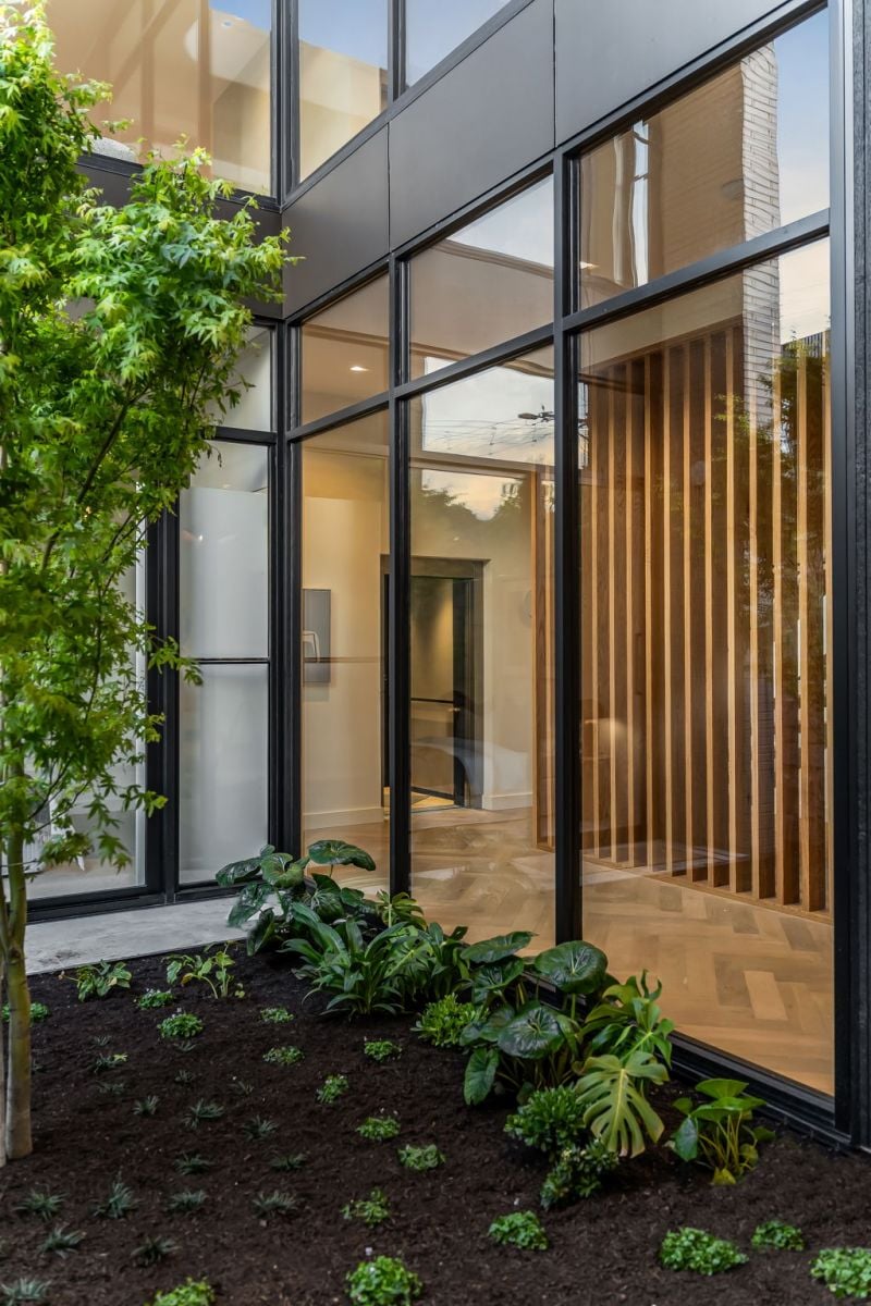 The lower level opens with a pair of serene bedrooms, arranged around a glazed light well courtyard, anchored by a solitary Japanese maple.