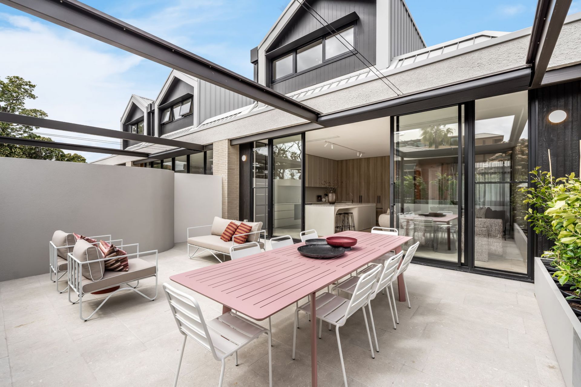 Beyond, full-height glazing retracts to reveal a stone-paved terrace bathed in northern light and protected by a motorised awning.