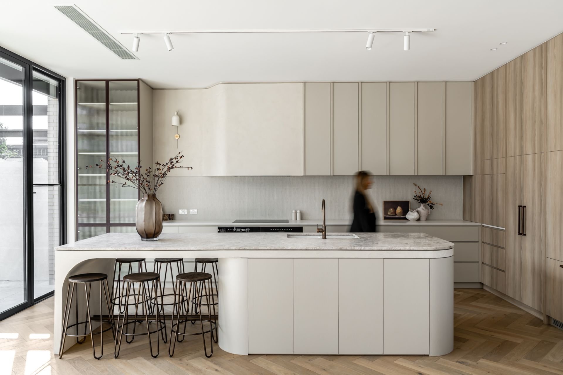 Ascend via open-tread steel stairs or your private lift to the beating heart of the home - an expansive living and dining zone defined by Venetian plaster, herringbone oak floors and a Miele-laden kitchen draped in Pietra limestone.