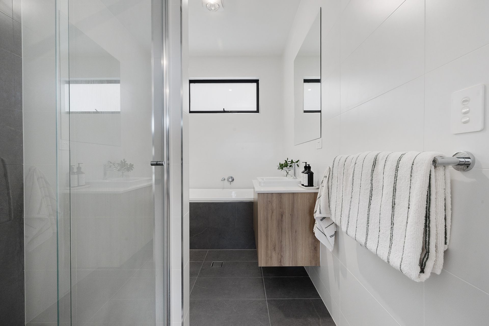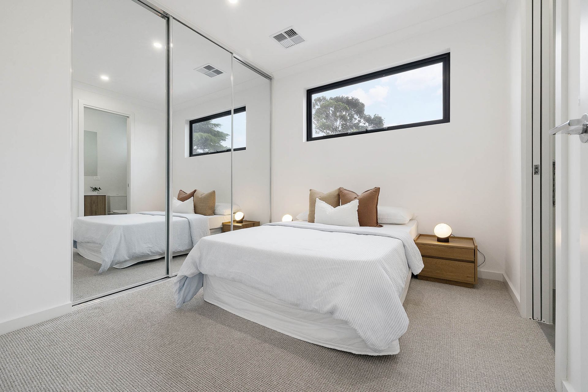Head to the top floor and it's all about relaxation and retreat. The master suite brings the luxe with a walk-in robe and a sleek ensuite featuring a full-sized bath for those end-of-day soaks. Bedroom two keeps the style game strong with its own ensuite and mirrored built-in robes that bounce the light and add a touch of glamour.