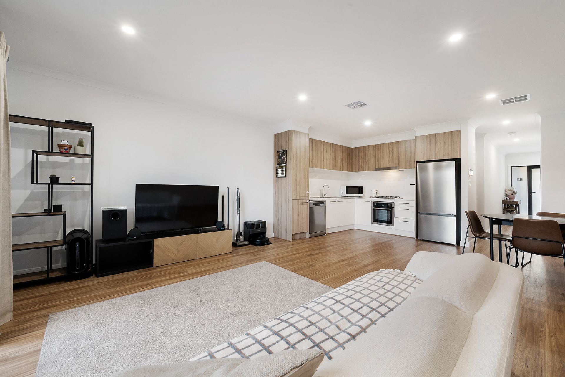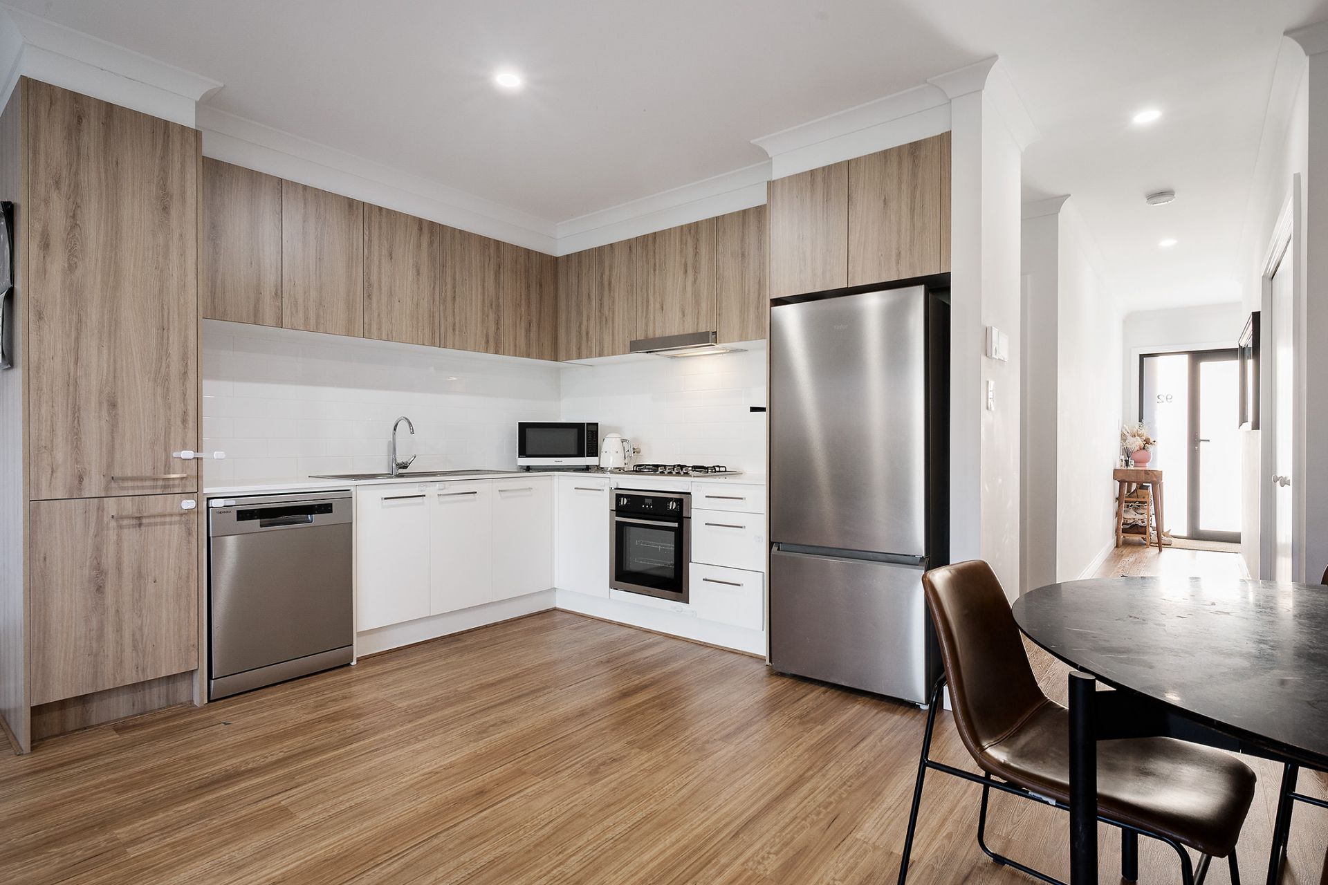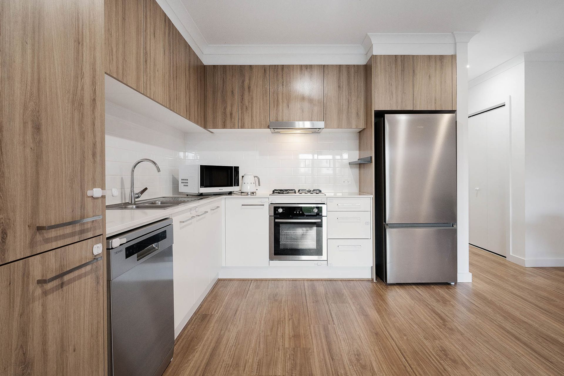 • Sleek kitchen with stainless-steel dishwasher, gas cooktop and timber-look cabinetry