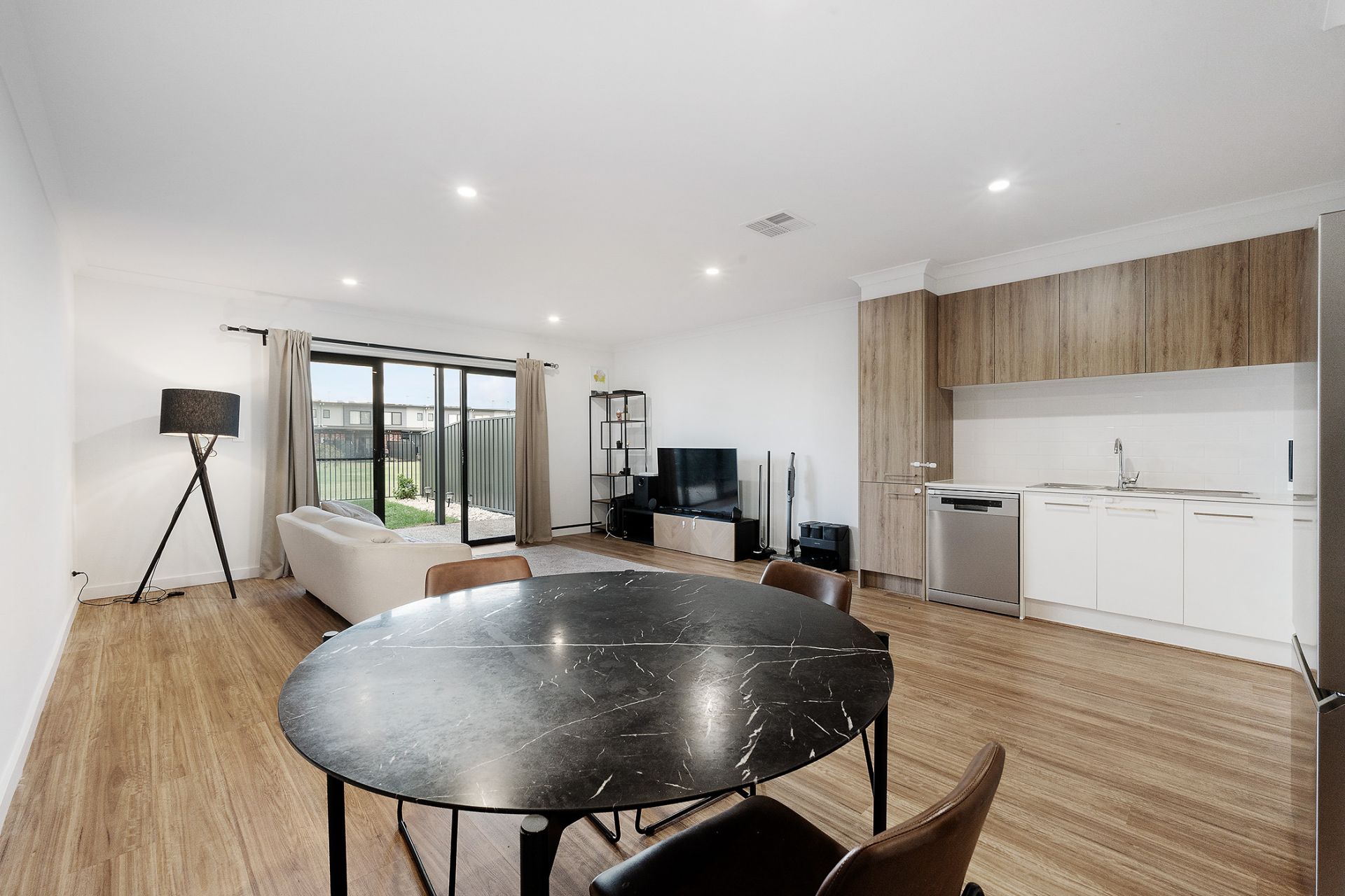 Polished timber-look floors sweep from front to back, connecting a sleek kitchen to lounge and dining in one spacious, light-filled sweep that spills to a covered alfresco patio; a true indoor-outdoor continuum. Fire up the BBQ, pour a glass and watch the sun sink behind the reserve.