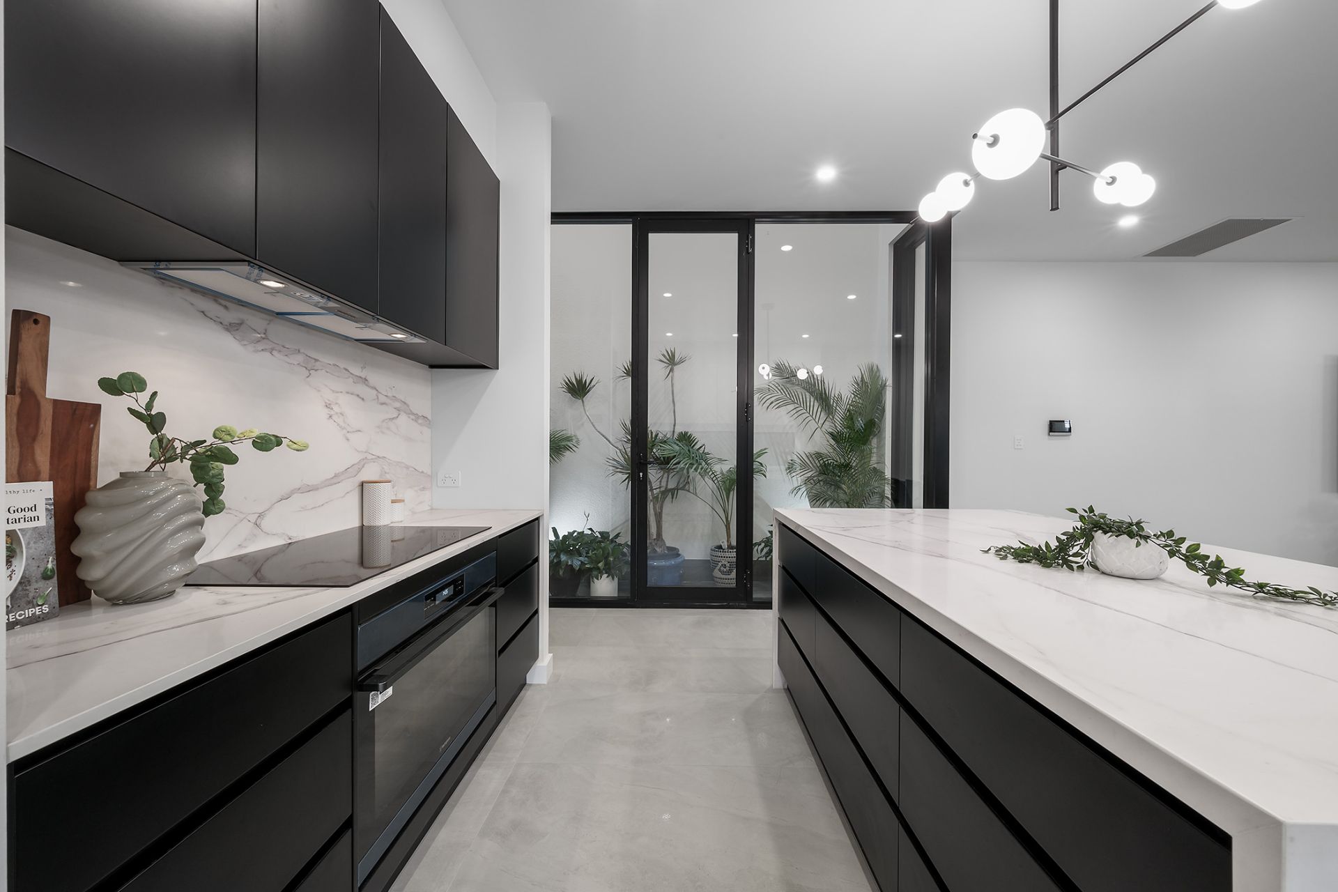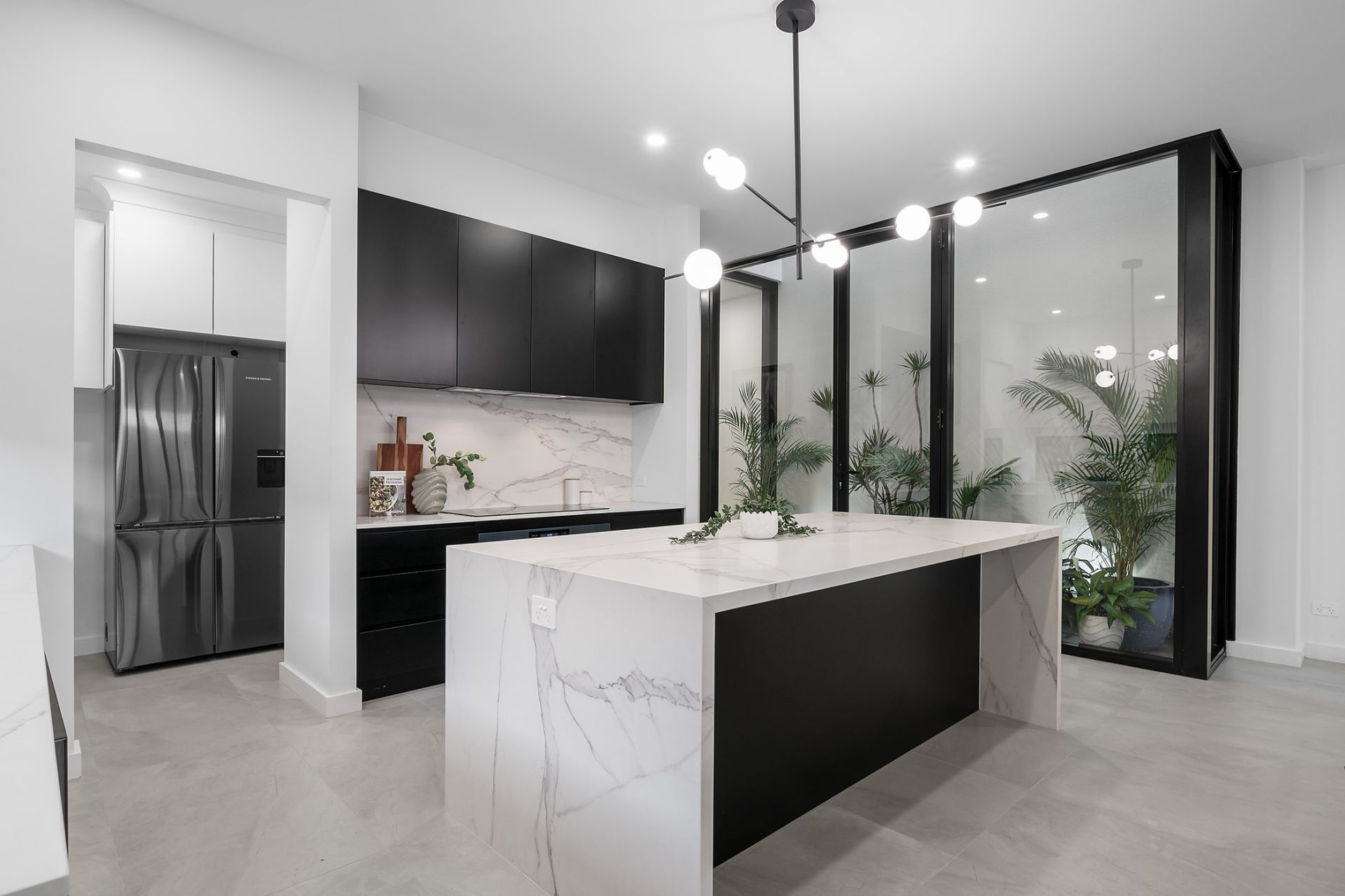 It's all a prelude to the true star here; expansive open-plan living that gravitates to its stone-laden kitchen with monochromatic tones, 90cm appliances, designer pendant, breakfast bar and butler's pantry.
