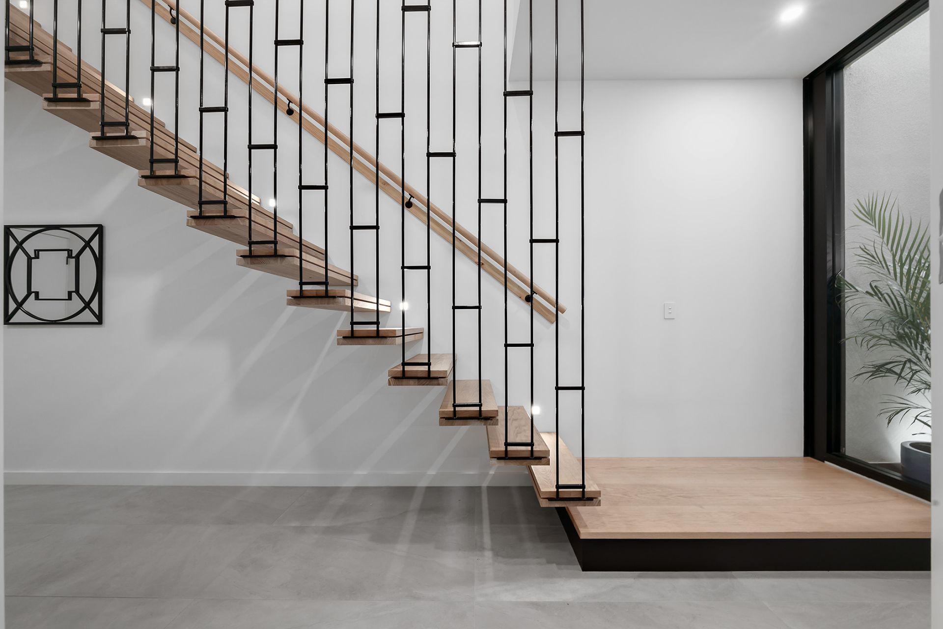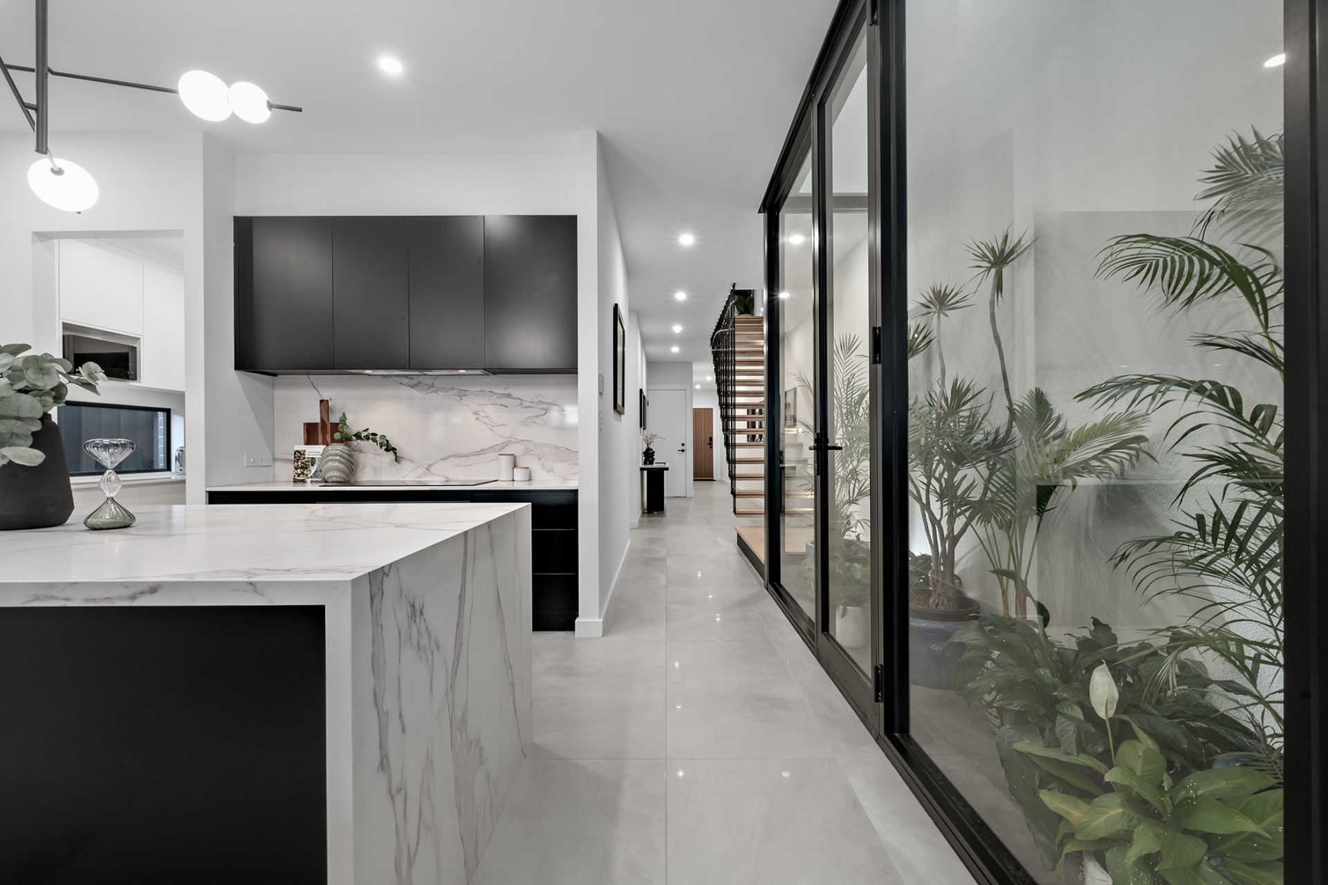 Step inside and your eyes are instantly drawn through the spine of a light-filled lower level defined by its floating staircase, atrium, soaring ceilings and chevron solid timber floors.