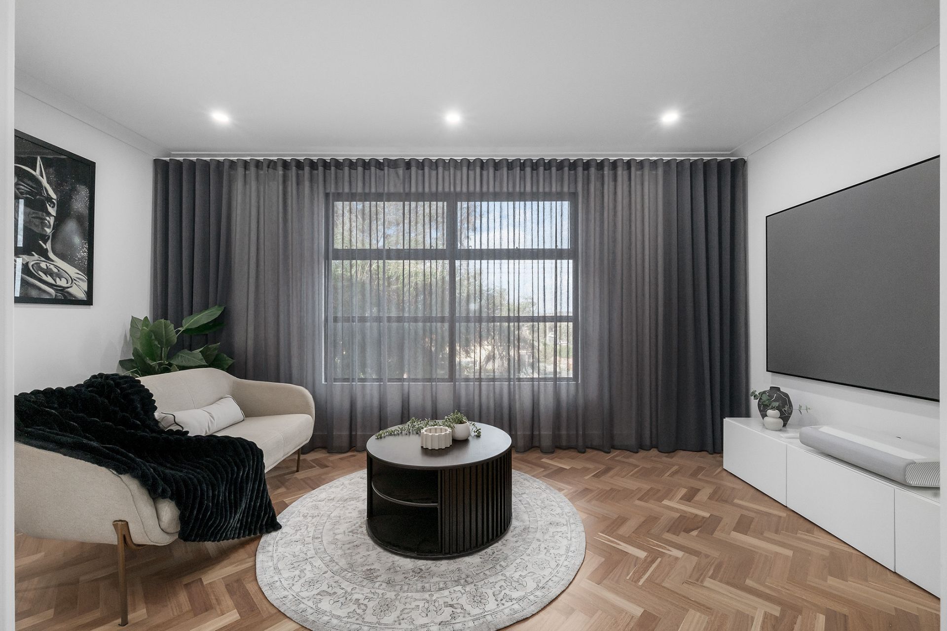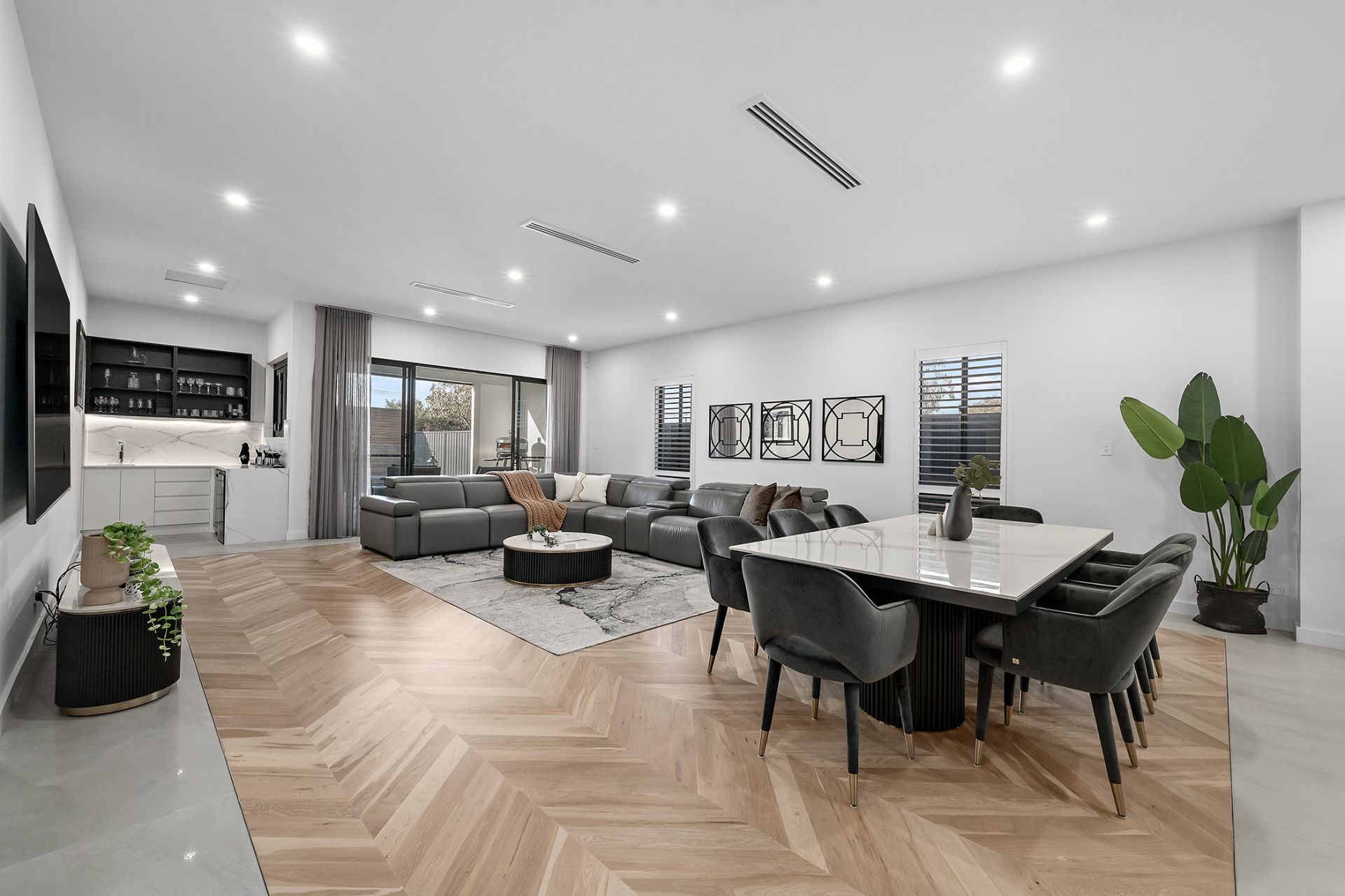 • Expansive open-plan living zone with soaring ceilings, atrium feature and chevron solid timber floors